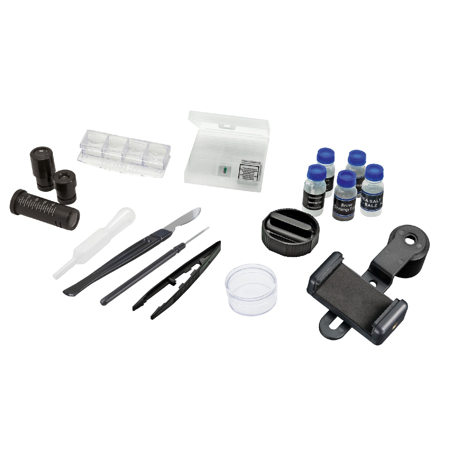 Перелік аксесуарів включає готові слайди, до огляду яких можна приступити негайно. Також в наборі є аксесуари для препарування зразків, мікротом для самостійного приготування зразків, інкубаторій і препарати для самостійного приготування.