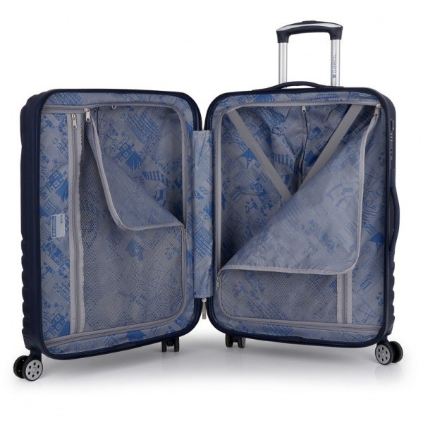 - Чемодан розділений перегородкою на блискавці на два основних відділення, перегородка має додаткові кишені на блискавках