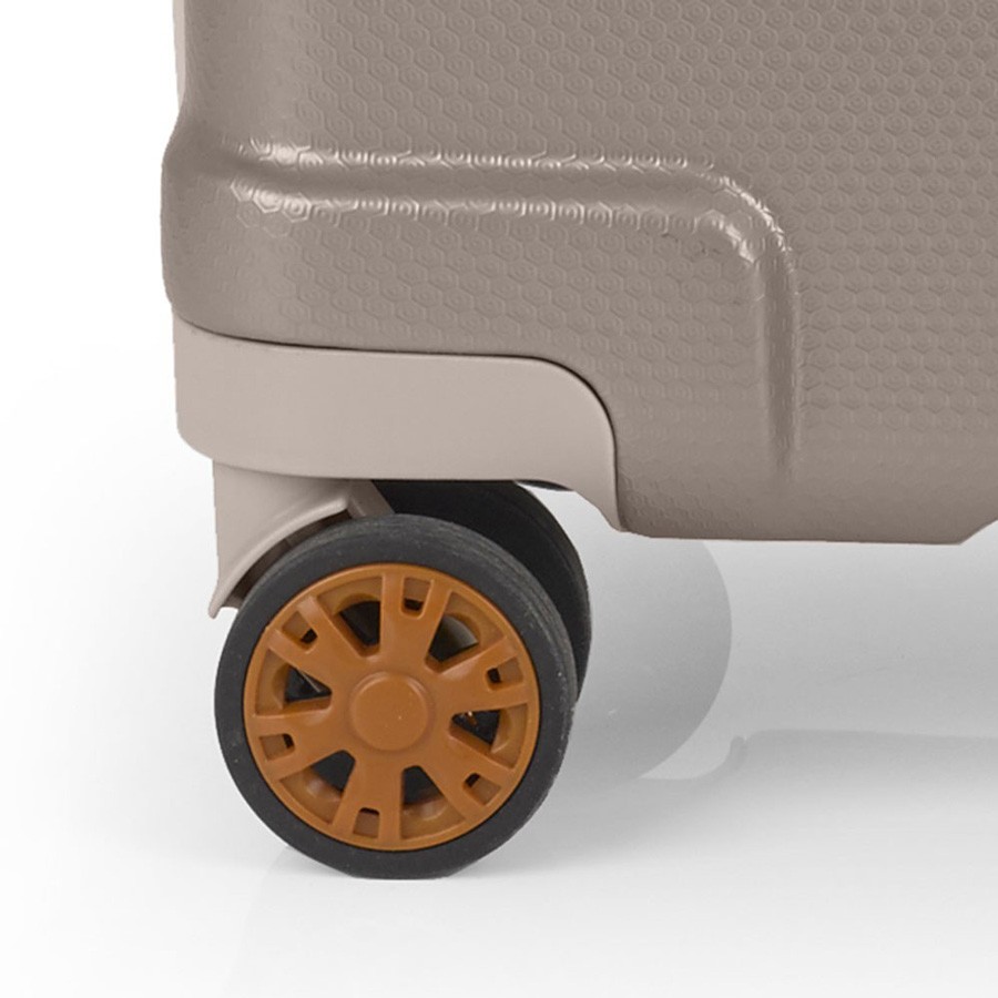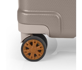 Чемодан оснащений чотирма повноповоротними, спареними колесами з можливістю незалежного розвороту кожного колеса на 360 °. Системою передбачено рівномірне перерозподілу навантаження на кожне колесо, що в свою чергу сприяє плавному коченню і маневреності валізи, докладаючи при цьому мінімум зусиль. Колеса виготовлені з високотемпературного термопластичного поліуретану (TPU). Матеріал володіє міцністю порівнянної з пластиком, гнучкістю силікону, а так само має підвищену стійкість до перепадів температур. Відмінною особливістю коліс з TPU матеріалу є зниження шуму до мінімуму при коченні валізи по нерівній поверхні. Завдяки стійкості до стирання матеріал коліс відрізняється тривалим терміном експлуатації.