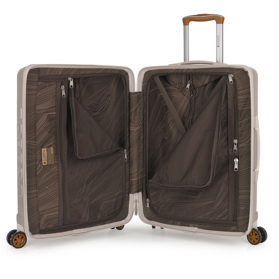 Колекція валіз Gabol Mosaic виконана з міцного і довговічного матеріалу - ABS-пластика, що дуже важливо для валіз, що перевозяться в багажних відділеннях. Внутрішній об'єм розділений на два відділення і має ремені для фіксації речей всередині. Чемодан обладнаний фірмовим кодовим замком з функцією митного огляду TSA. Чемодан легкий, маневрений і зручний для транспортування.