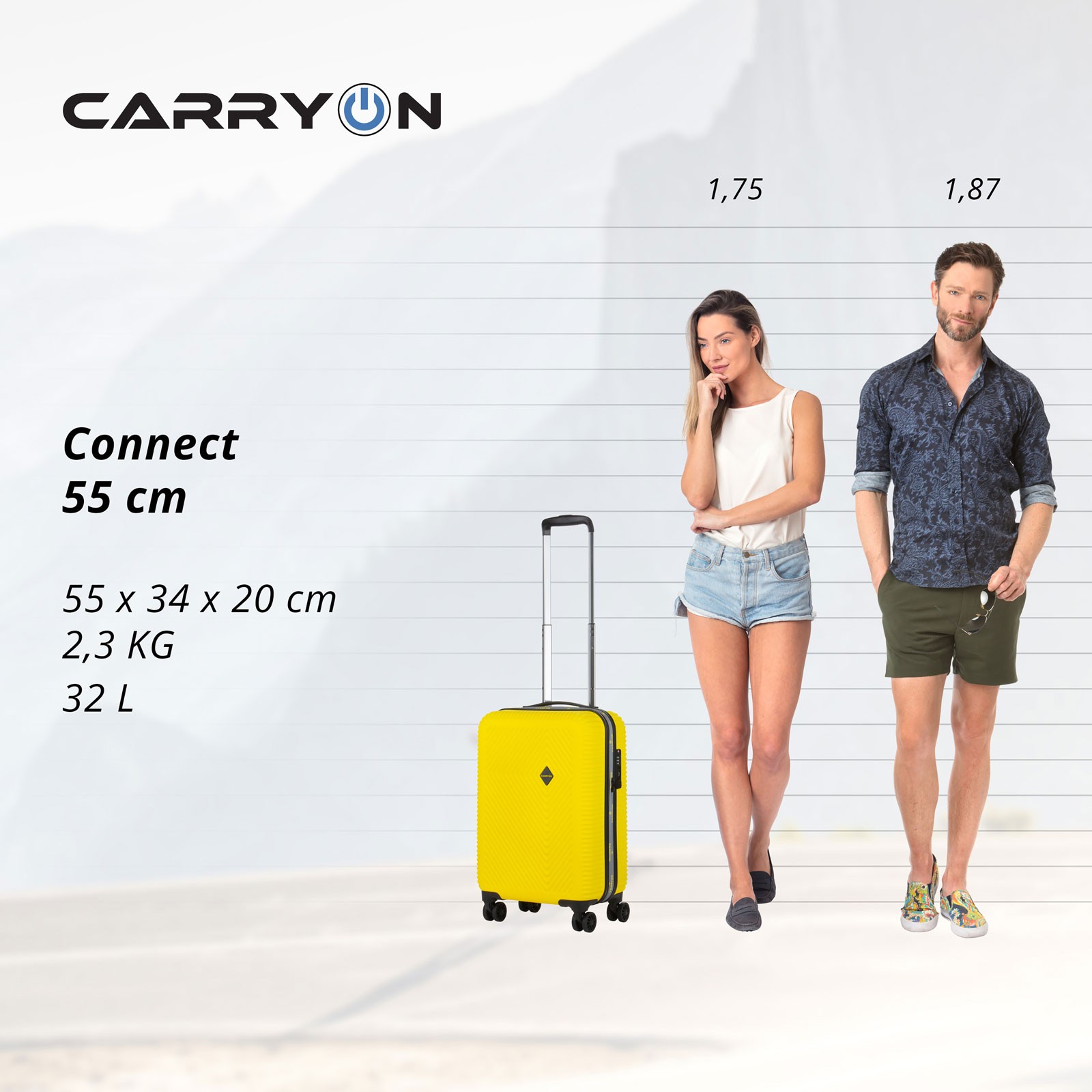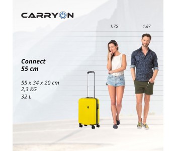 Серію валіз CarryOn Connect виділяють практичний і оригінальний малюнок, нанесений на корпус валізи методом тиснення принта. Ромбічний візерунок буде ефектно виглядати на протязі всього терміну експлуатації виробу. Валізи виготовлені з міцного, комбінованого матеріалу Polycarbonate /ABS-пластика. Модель обладнана бризкоозахищеним блискавкою яка забезпечує додатковий захист під час короткочасного дощу. Зарядити свої гаджети швидко і легко можливо за допомогою вбудованого USB-порту, а продуманий дизайн внутрішнього органайзера раціонально оптимізує місце у валізі. всі валізи серії Connect обладнані унікальною і єдиною на даний момент системою пошуку і реєстрації знайдених і втрачених речей - Okoban.