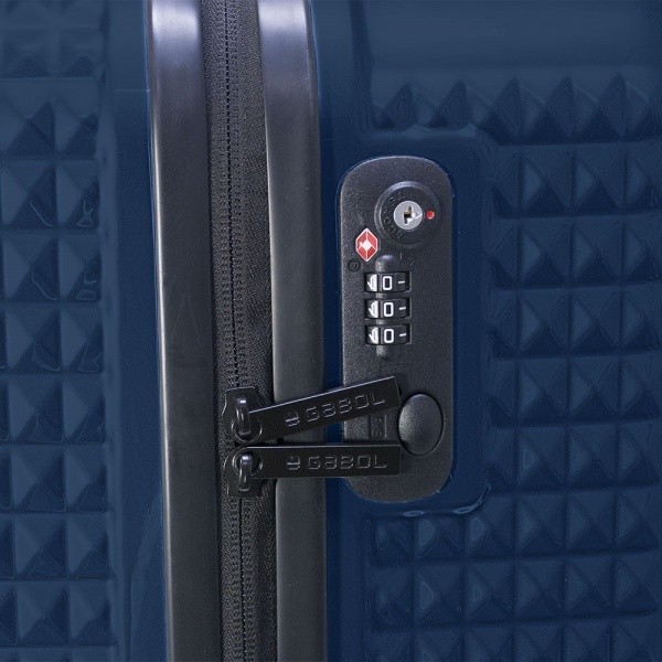 Колекція валіз Gabol Quartz виконана з унікального композитного матеріалу ABS /Polycarbonate. Міцний, стійкий до зносу і деформацій матеріал поєднує в собі переваги полікарбонату і ABS-пластика, що дуже важливо для валіз, що перевозяться в багажних відділеннях. Модель відповідає мінімально обмеженим розмірами ручної поклажі, затвердженим бюджетними міжнародними авіакомпаніями при авіаперельотах. Внутрішній об'єм розділений перегородкою на два відділення і має ремені для фіксації речей всередині. Чемодан обладнаний фірмовим кодовим замком з функцією митного огляду TSA. Чемодан легкий, маневрений і зручний для транспортування.