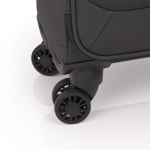 Чемодан оснащений чотирма спареними роликовими колесами з високотемпературного термопластичного поліуретану (TPU). Матеріал володіє міцністю порівнянної з пластиком, гнучкістю силікону, а так само має підвищену стійкість до перепадів температур. Відмінною особливістю коліс з TPU матеріалу є зниження шуму до мінімуму при коченні валізи по нерівній поверхні. Завдяки стійкості до стирання матеріал коліс відрізняється тривалим терміном експлуатації.