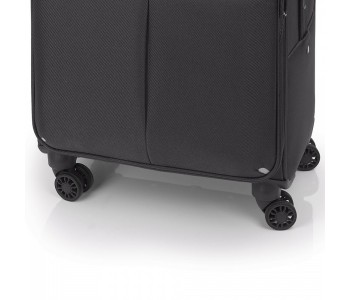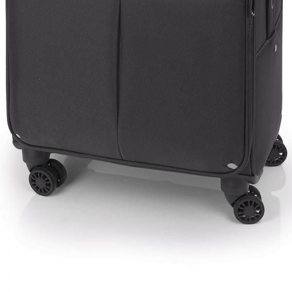 Чемодан оснащений чотирма спареними роликовими колесами з високотемпературного термопластичного поліуретану (TPU). Матеріал володіє міцністю порівнянної з пластиком, гнучкістю силікону, а так само має підвищену стійкість до перепадів температур. Відмінною особливістю коліс з TPU матеріалу є зниження шуму до мінімуму при коченні валізи по нерівній поверхні. Завдяки стійкості до стирання матеріал коліс відрізняється тривалим терміном експлуатації.