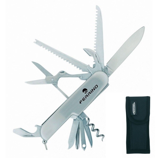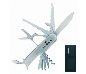 Кишеньковий мультитул Ferrino 11 Functions, як випливає з назви, має 11 інструментів, чого буде цілком достатньо для виконання більшості завдань в похідних умовах. Корпус і інструменти повністю виконані з нержавіючої сталі, що гарантує стійкість до ткоррозіі і тривале використання мултітула. Мультитул укладається в невеликий текстильний чохол на застібці Velcro з можливістю кріплення.
