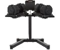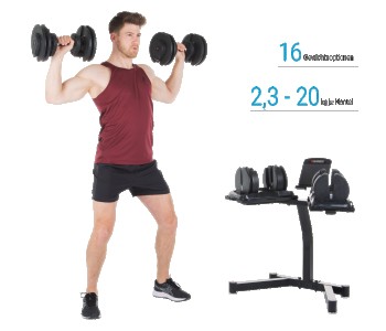 Продумана система настройки дає вам вибір з 16 варіантів ваги в діапазоні від 2,3 до 20 кг. Для зміни настройки достатньо однієї руки. Просто дотримуйтесь шкалою ваги в кг, щоб вибрати бажаний рівень ваги. Перехід від однієї настройки ваги до іншої не може бути простіше. Просто поверніть ручку, щоб вибрати бажану вагу. Один рух змінює установку ваги з обох сторін гантелі.
