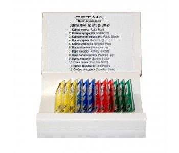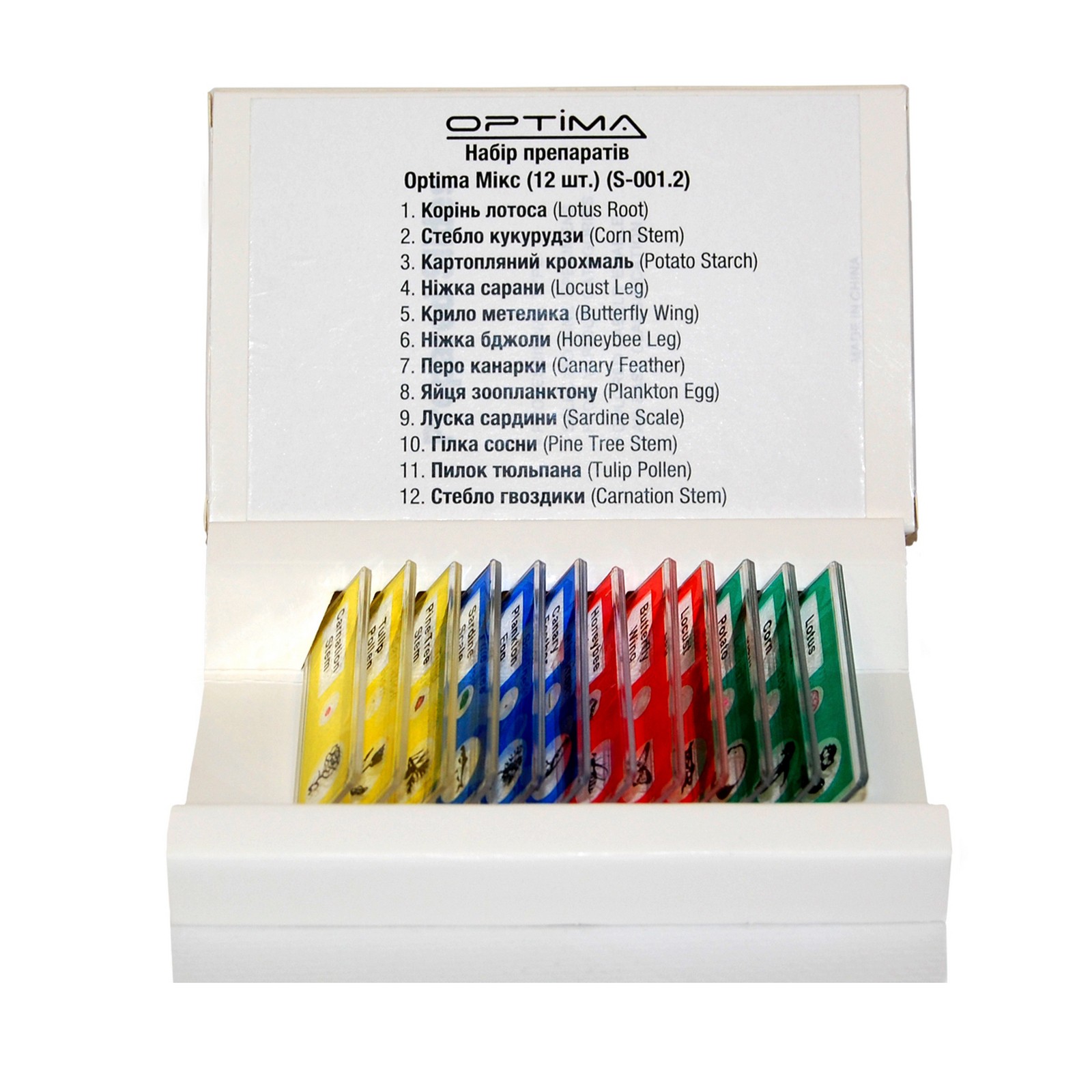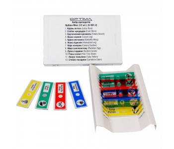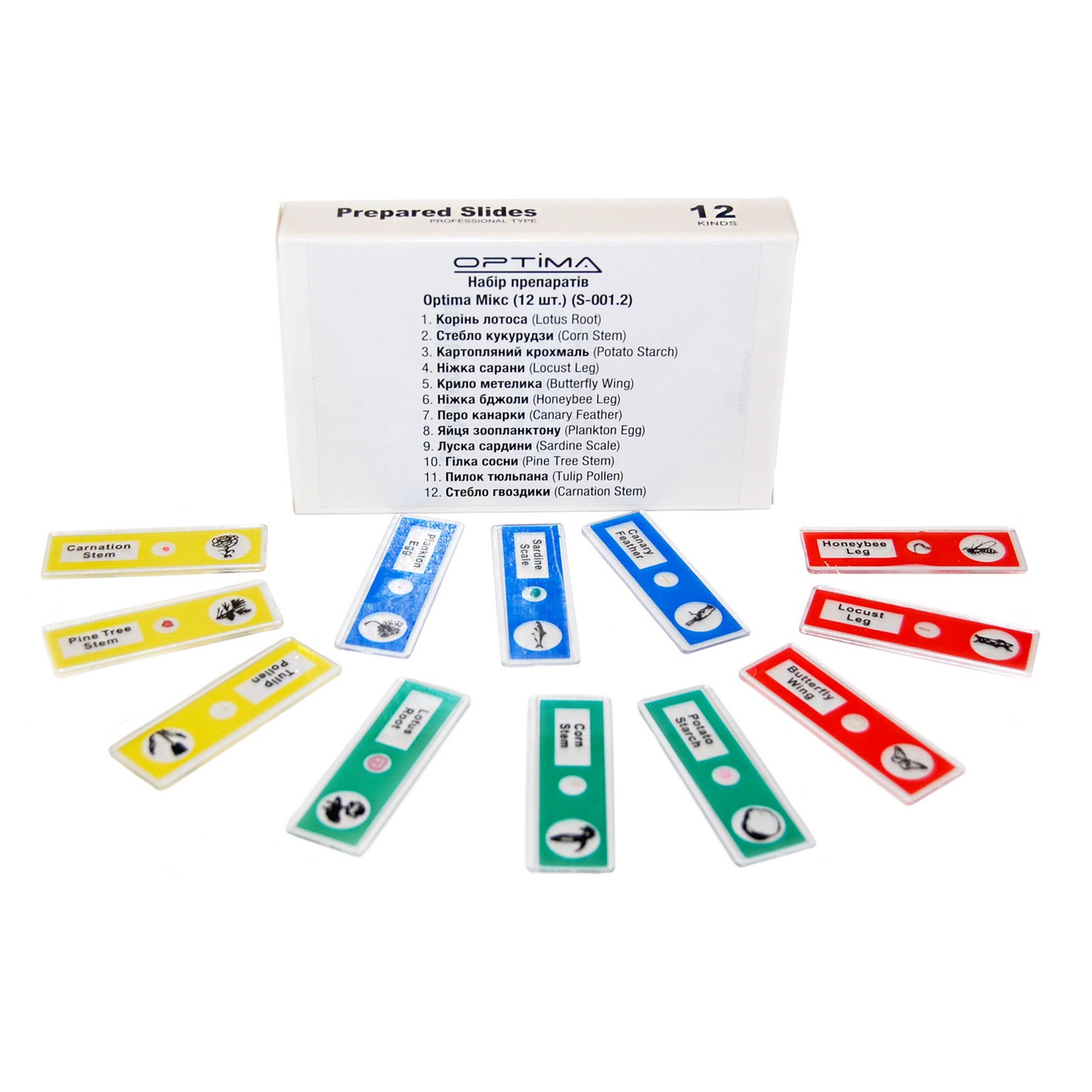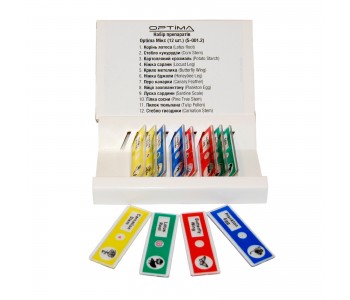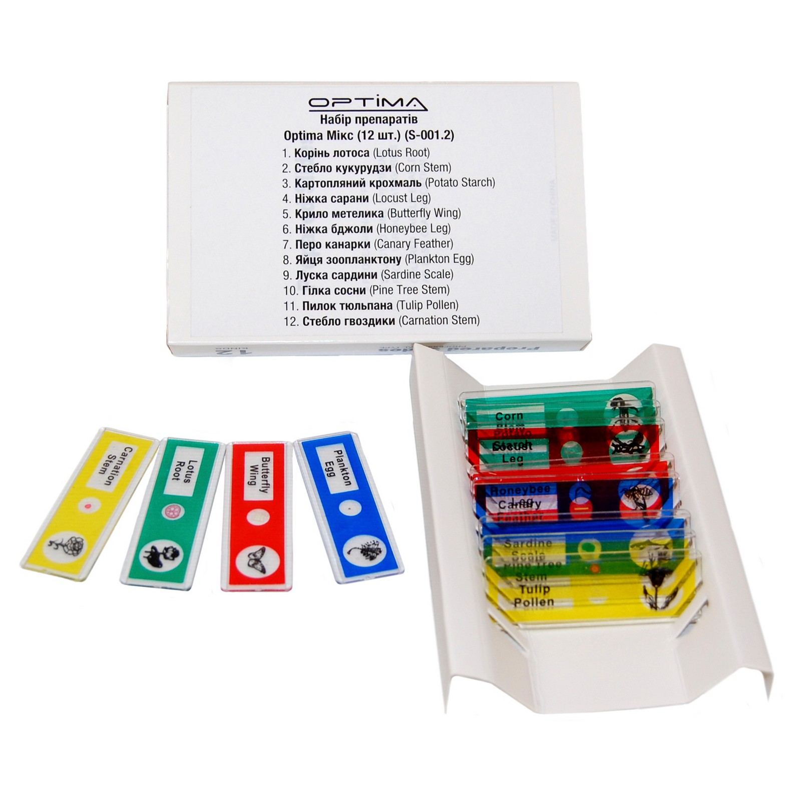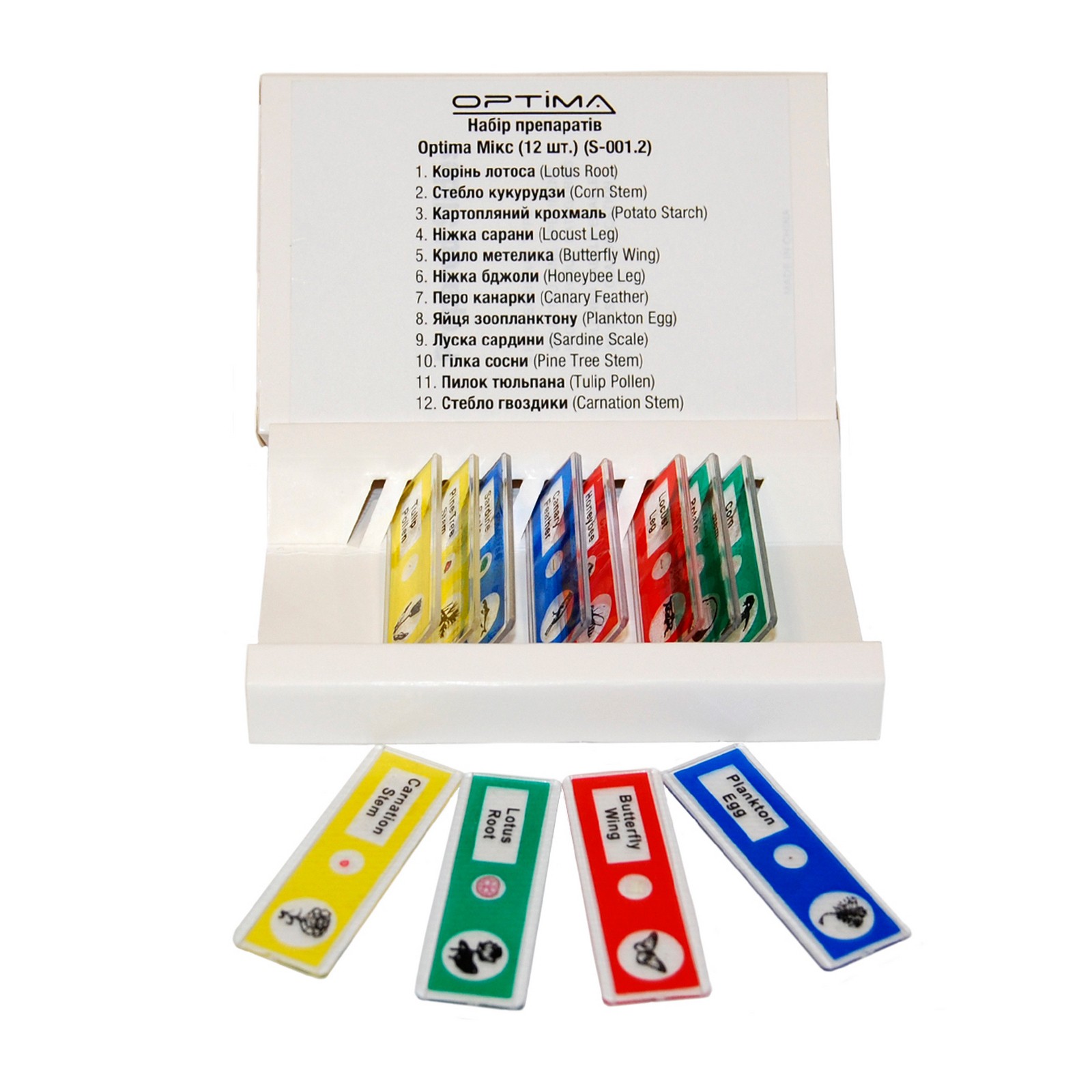 Набір, який включає дванадцять спеціально підготовлених слайдів із зразками комах, покривними тканинами птахів і риб, тонкими зрізами овочів та інших рослин для спостереження під мікроскопом, стане відмінним доповненням до дитячого мікроскопу. Набір є необхідним посібником для шкільного класу біології, оскільки вивчення всіх включених зразків передбачено шкільною програмою. Всі зразки підібрані таким чином, що для їх вивчення досить біологічного мікроскопа з максимальним збільшенням 400 крат. Не менш, а може бути і більш захоплюючим стане і спостереження даних слайдів в стереоскопічні мікроскопи зі збільшенням 20-40 крат.