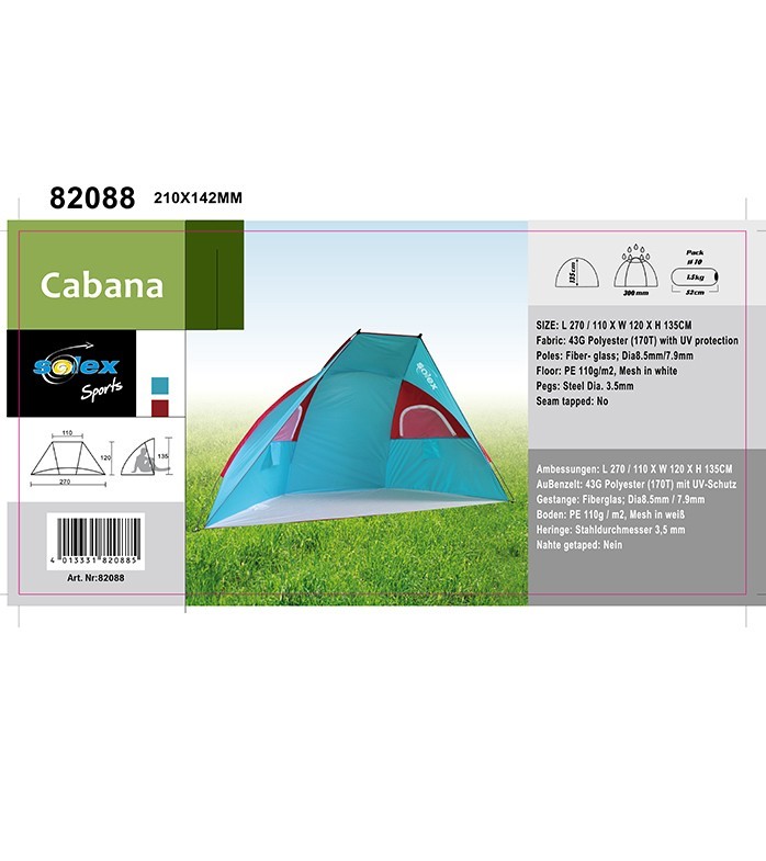 Наявність хорошої вентиляції не дозволяє повітрю застоюватися всередині намету, навіть коли вона повністю закрита. Намет пляжна Солекс Біач Кабана 82088 це сучасний намет, що неймовірно простий в налаштуванні завдяки своїй зручній і простій конструкції. Водостійка і стійка до ультрафіолетового випромінювання тканину забезпечить відмінний захист від дощу і сонячних променів.