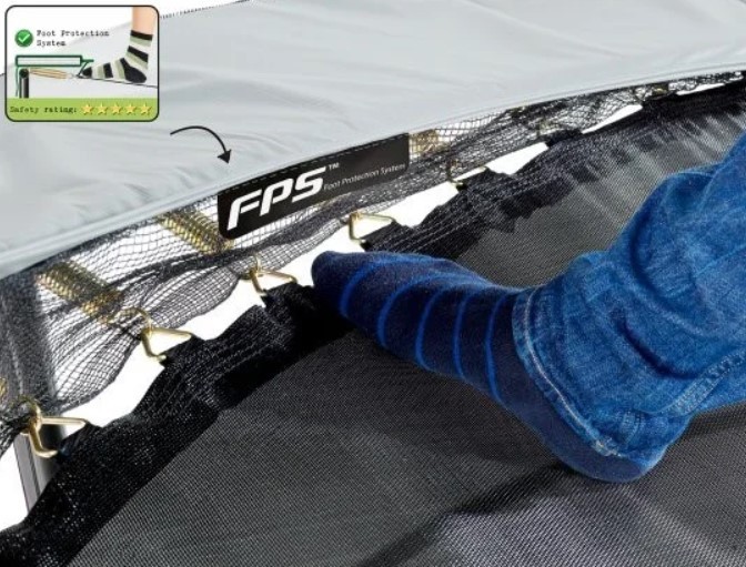 Захисна накладка міцна і має систему захисту ніг (FPS), яка була спеціально розроблена компанією EXIT Toys для запобігання попадання ваших ніг в пружини при підстрибування.