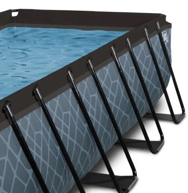Виріб виглядає сучасно і стильно, з зовнішньої сторони - тканину із забарвленням quot; каменьquot ;, що робить його розміщення в саду, на дачі або у дворі приватного будинку особливо привабливим. Усередині - покриття синього кольору, що створює відчуття свіжості і прохолоди. Басейн EXIT оснащений трьох кульовими стінами, виготовленими з ПВХ та поліестеру.