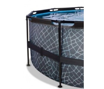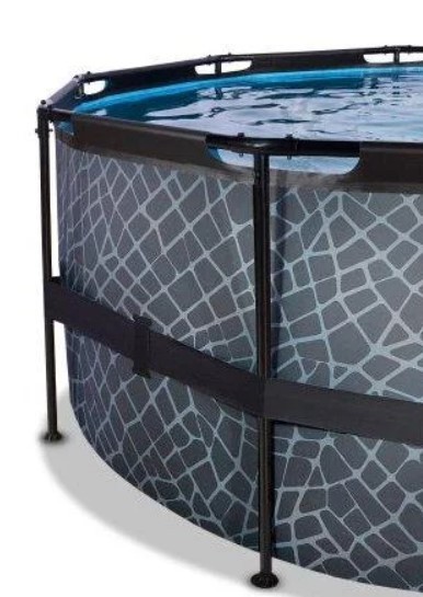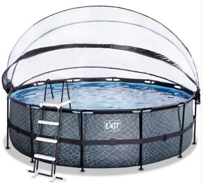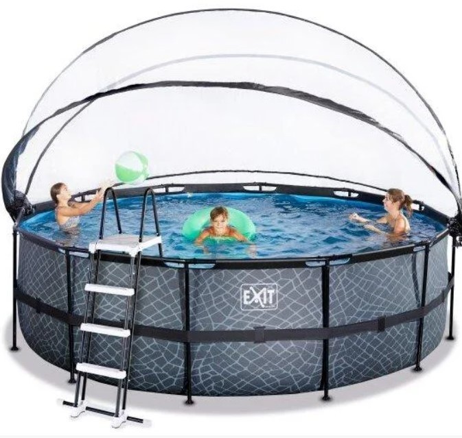 Басейн з куполом EXIT камінь 450х122 см (пісочний фільтр) виглядає лаконічно і елегантно. Із зовнішнього боку - тканину із забарвленням у вигляді кам'яної стіни, що зробить його розміщення в саду, на дачі або у дворі будинку особливо естетичним.