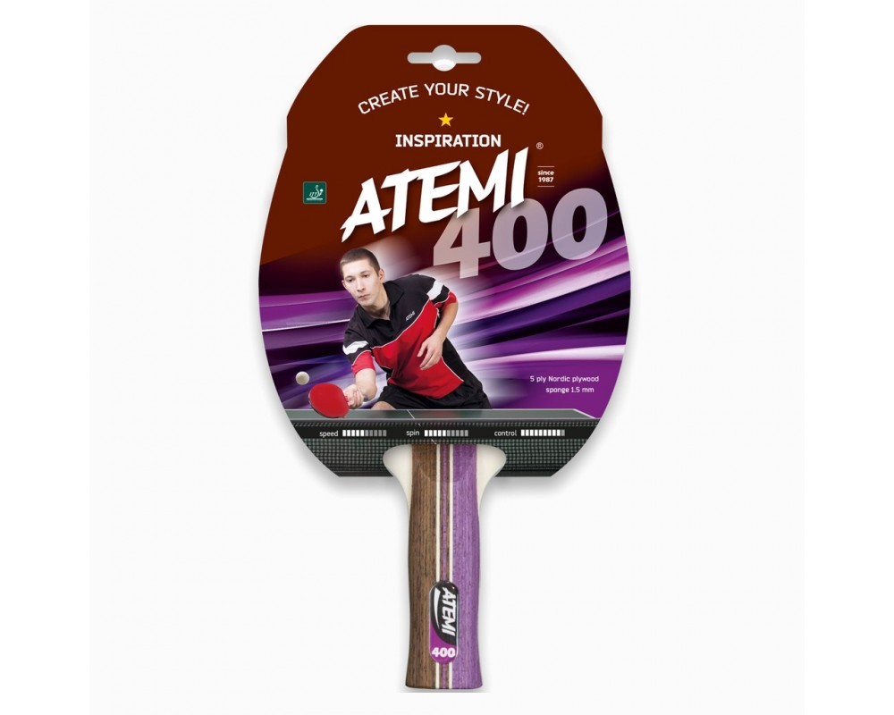 Ракетка ATEMI 400 А * для спортсменів аматорів. Комбінація швидкості, обертання і контролю гумової накладки Challenge (ITTF), дозволяє використовувати цю ракетку для різних стилів гри.