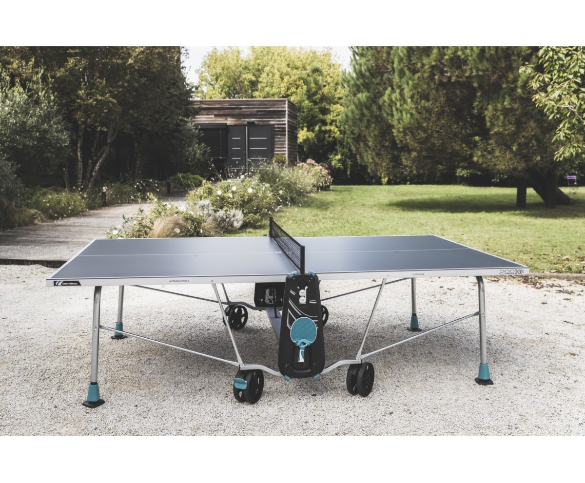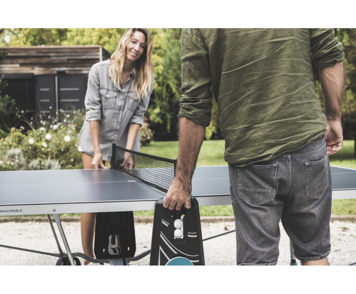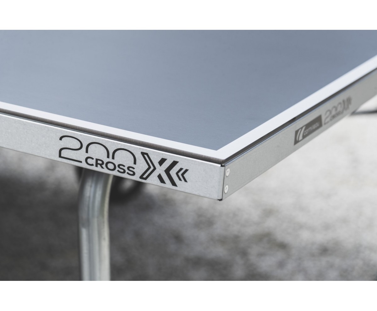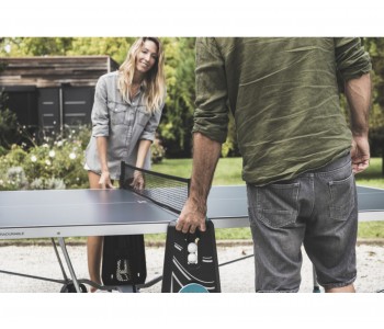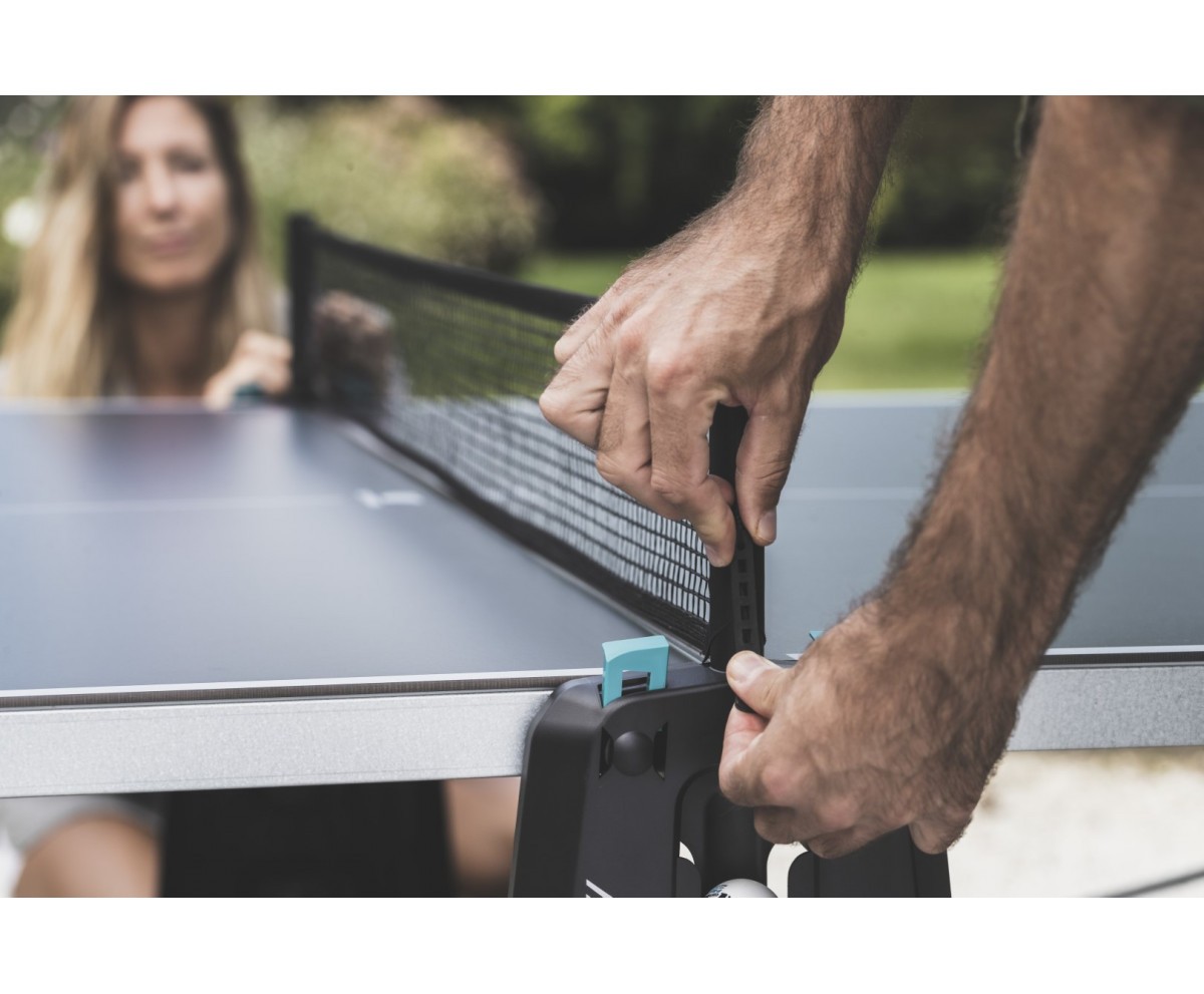 Покриття SOFTMAT зменшує відблиски від сонця, а система регулювання ніжок дозволяє встановити стіл на будь-якому типі ґрунту — газоні, гравії чи навіть піску. Конструкція з антикорозійного Aluzinc® гарантує тривалий термін служби, а зручні функції — простоту експлуатації та зберігання. Надійна система блокування та компактне складання роблять Cornilleau 200X безпечним навіть у побутових умовах.