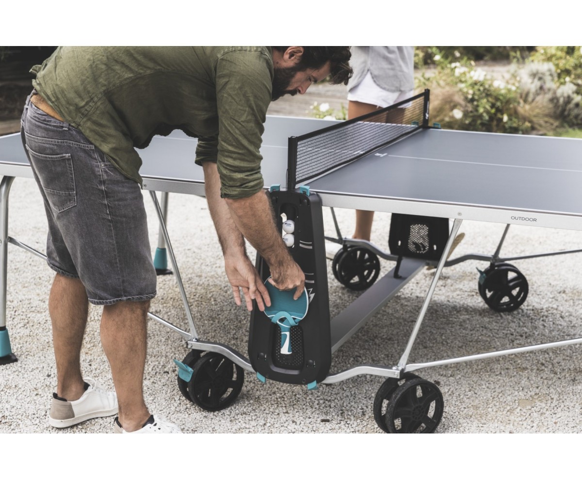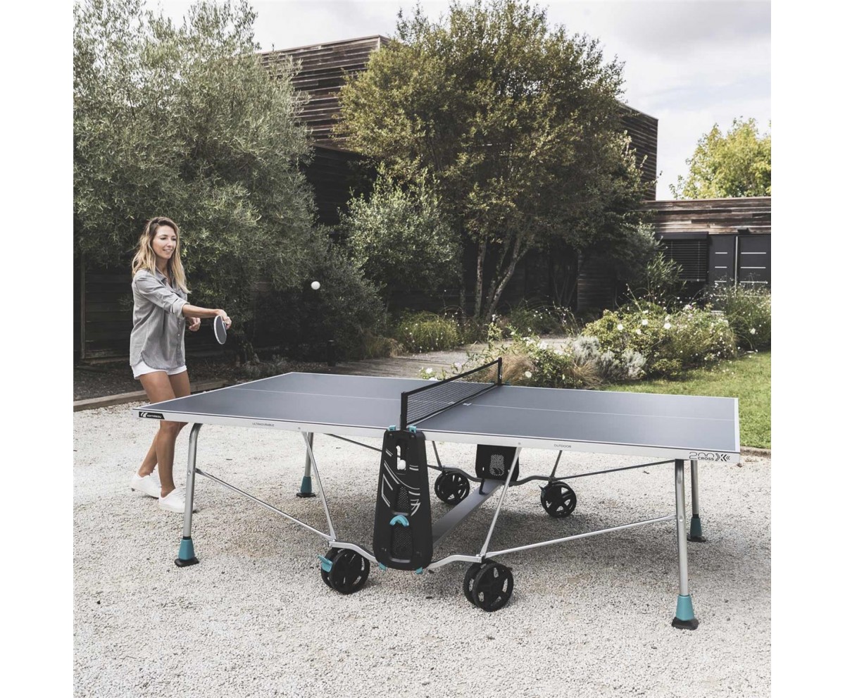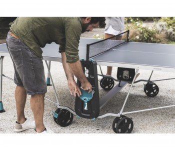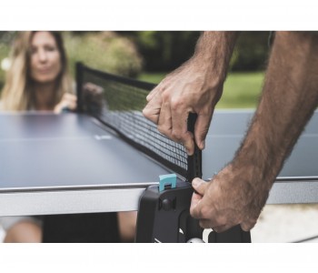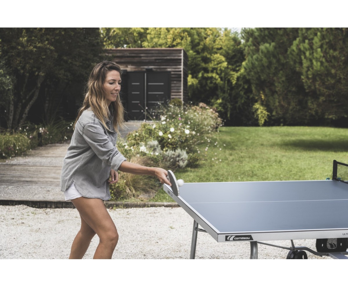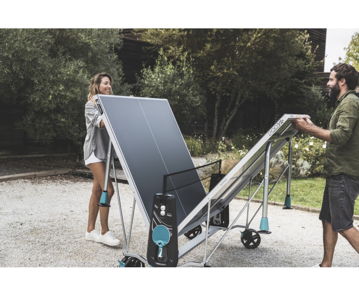 Покриття SOFTMAT зменшує відблиски від сонця, а система регулювання ніжок дозволяє встановити стіл на будь-якому типі ґрунту — газоні, гравії чи навіть піску. Конструкція з антикорозійного Aluzinc® гарантує тривалий термін служби, а зручні функції — простоту експлуатації та зберігання. Надійна система блокування та компактне складання роблять Cornilleau 200X безпечним навіть у побутових умовах.