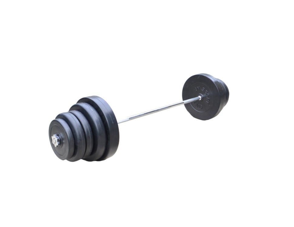 Розбірна штанга з пластиковим покриттям на 83 кг складається з десяти дисків різної ваги, що дозволяє робити навантаження більше або менше з мінімальним кроком ваги.
