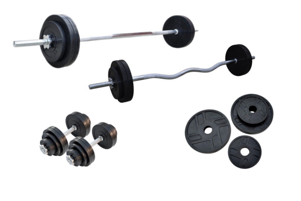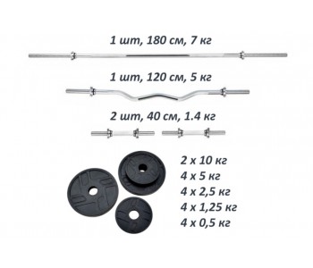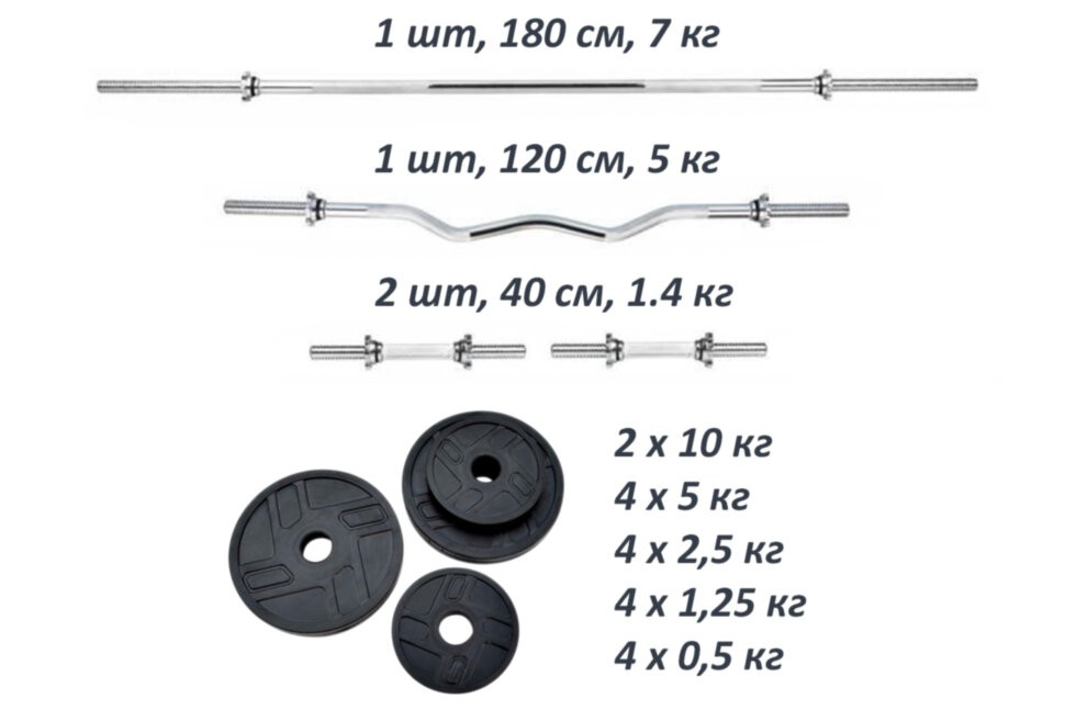 Два стрижні + дві гантелі. Набір металевих кругових дисків 57 кг + 4 хромової сітки Obtop57