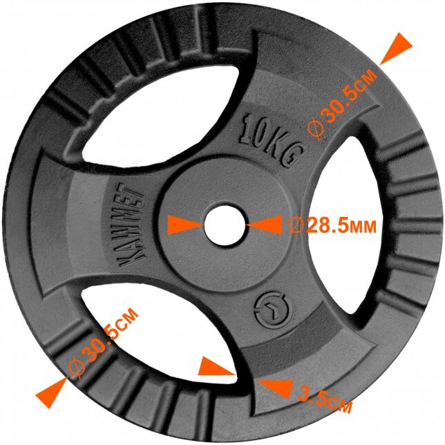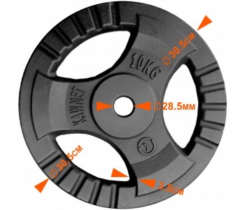 Чорт (диск) 10 кг для гантелей (стрижнів) з потрійним зчепленням Ø28 мм