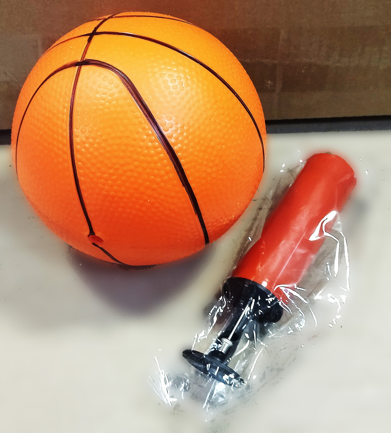 Комплектується дитячим баскетбольним м'ячем, насосом і голкою для накачування м'яча.