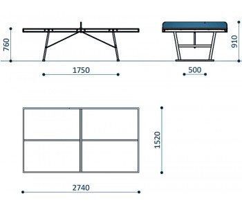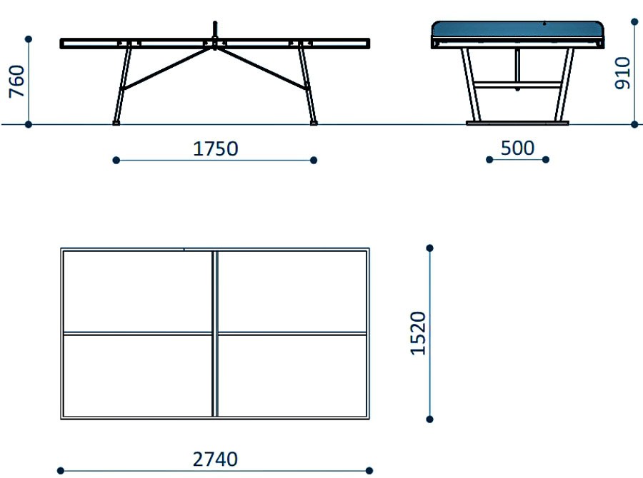 Вуличний тенісний стіл з металу має міцну металеву конструкцію, яка дає змогу йому витримувати вплив погодних умов і використання на відкритому повітрі. Стільниця виготовляється зі спеціальної обробленої пластини, яка забезпечує гарне підскакування м'яча та довговічність, стіл відповідає офіційним розмірам стандартного тенісного столу - 2,74 метра завдовжки, 1,525 метра завширшки та 76 сантиметрів заввишки.