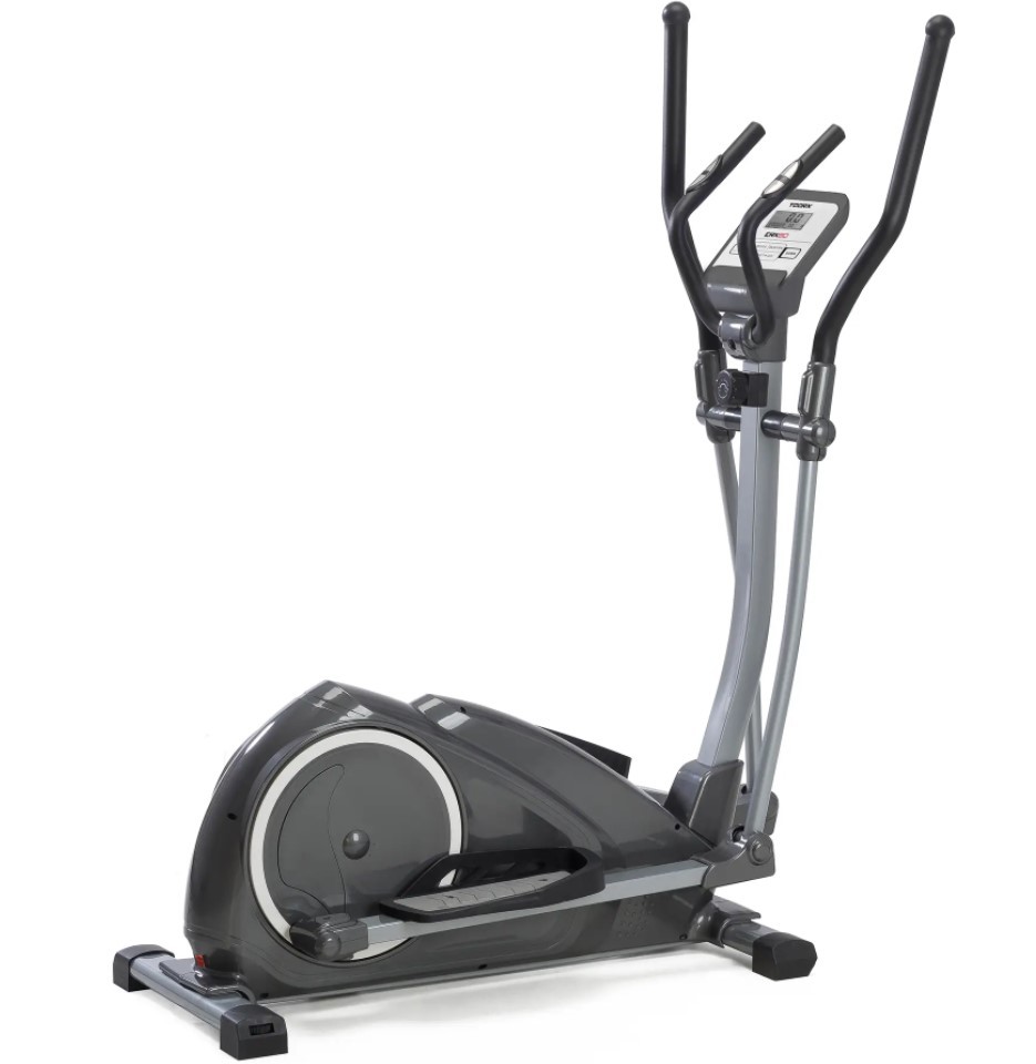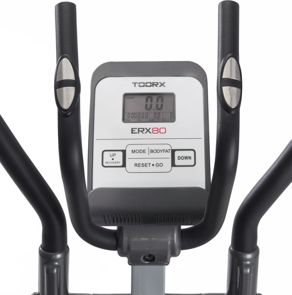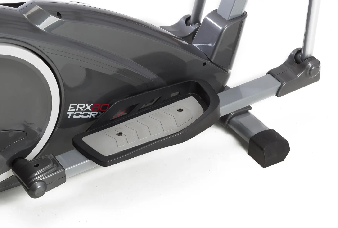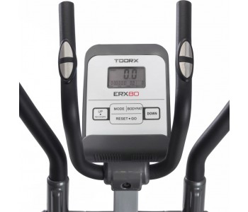 Орбітрек Toorx Elliptical ERX 80 (ERX-80) від італійського виробника Garlando S.p.A. призначений для повноцінного кардіотренування в домашніх умовах. Тренажер має 8-рівневе ручне регулювання навантаження, а також простий у використанні комп'ютер. 14-кілограмовий маховик створює гарну плавність ходу, знижуючи навантаження на суглоби та мінімізуючи ризик отримання травми в процесі занять. Орбітрек розрахований на вагу до 120 кг, а довжина кроку 34 см підійде для користувачів середнього зросту. Вбудовані сенсорні датчики вимірювання пульсу будуть доречними під час тренування для контролю частоти серцевих скорочень. Платформи для ніг регулюються в 3-х положеннях, а транспортувальні ролики в передній частині тренажера дозволяють переміщати його по кімнаті.