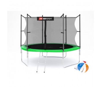 Основні характеристики: діаметр стрибкового полотна: 306 см загальний діамент: 366 см загальна висота: 260 см висота сітки: 180 см відстань від землі до мату: 80 см ширина захисного краю: 30 см товщина захисного краю: 2 см мат із поліпропілену: 275гр м.кв мат стійкий до ультрафіолетових променів та вологи 72 оцинкованих пружин: 137 х 3 мм 4 опори з металевого профілю: 38 х 1,2 мм рама батута з металевого профілю: 38 х 1,5 мм двоступінчаста драбинка поліетилену товщиною: 100 г/м.кв сертифікація безпеки TUV вага: 63 кг макс. вага навантаження: 150 кг