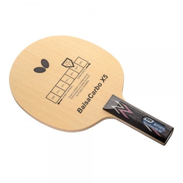 метелик Balsa carbo x5 ndash; Перша основа метелика компанії, дизайн якого використовує бальзам Ndash; Різноманітність деревини, що характеризується надзвичайною легкістю та м'якістю. Окрім бальзаму, базова структура включає вуглецеві шари, які роблять його більш динамічним. Завдяки незначній вазі, Balsacarbo X5 забезпечує відмінний контроль та м'яч -куля і робить гру на блоці комфортними та різноманітними. У той же час, наявність вуглецевих шарів не дозволить цій основі непридатну для гри в атакуючі. Balsa Carbo X5 є оптимальним для виконання верхніх обертів із середньої зони, а також для сильних атакувальних ударів за столом.