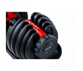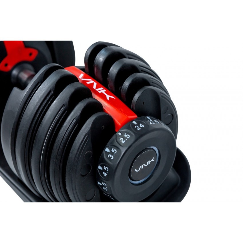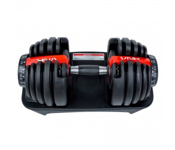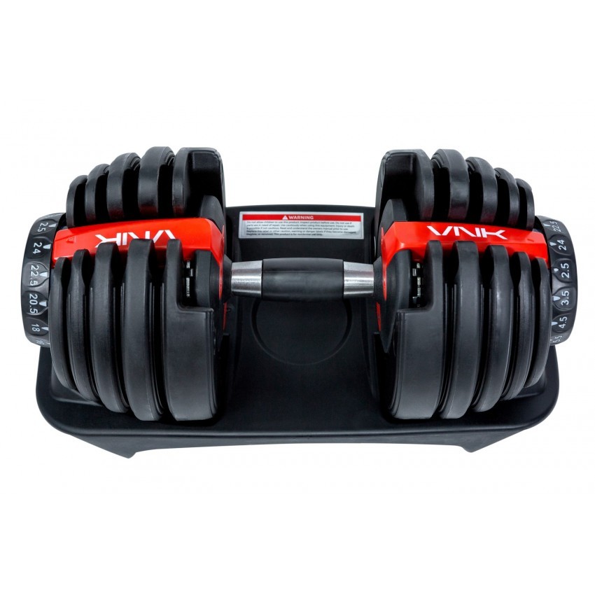 Тепер Ви легко зможете повноцінно тренуватися навіть удома: пара регульованих гантелей VNK заміняють 15 пар традиційних гантелей. Вага одного снаряда варіюється від 2,5 до 24 кг. Для зміни ваги достатньо одного повороту циферблату.