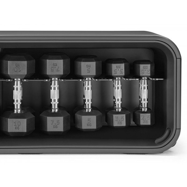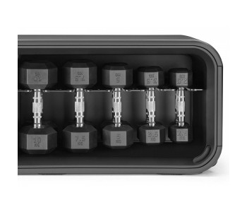 Вбудовані прокладки дозволяють розмістити п'ять пар шестигранних гантелей і не дають поранити пальці при поводженні з ними.