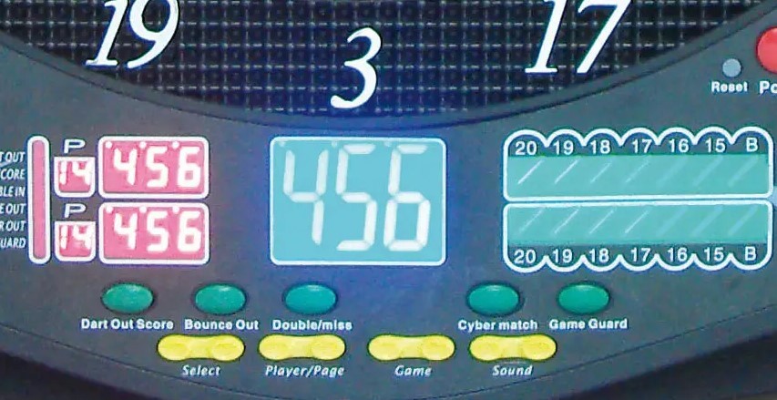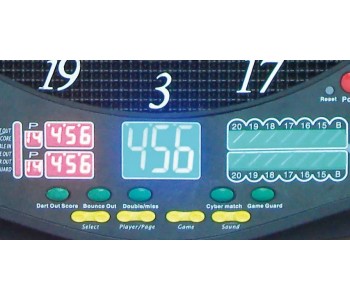 - - РК-дисплей з підсвічуванням. Червоне світло показує 2 гравців одночасно, активну функцію та загальну кількість балів. Синє світло показує рахунок кожного кинутого дротика. Зелене світло показує підрахунок очок.