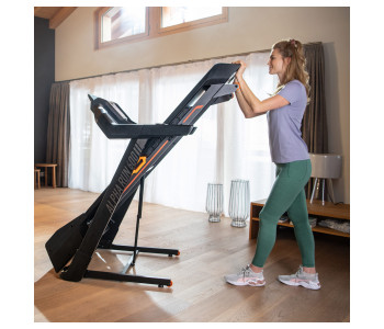 Бігова доріжка має механізм складання, тому в складеному вигляді займає мало місця. У складеному стані бігова доріжка займає (Д x Ш x В): 142,5 см x 93,5 см x 165,5 см