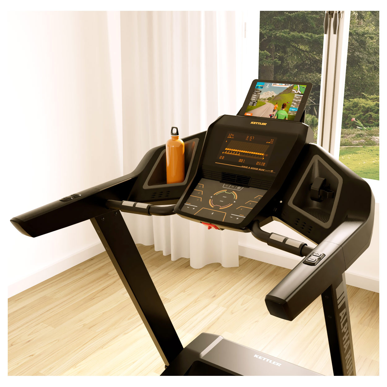 Бігова доріжка Kettler Alpha Run 600 дозволяє виконувати бігові тренування, не виходячи з дому. Бігова доріжка оснащена високоякісним тренажерним комп'ютером з інтуїтивно зрозумілим навігаційним меню, доступним на 3 мовах (німецька, англійська та французька). Розмір дисплея становить 190x110 мм , що означає, що найважливіші параметри залишаються читабельними навіть під час інтенсивних тренувань. Комп'ютер має 32 вбудовані тренувальні програми, завдяки яким можна регулювати інтенсивність тренувань під фізичну форму і стан користувача. Він дозволяє регулювати кут нахилу бігового полотна від 0 до 12% і швидкість від 1 до 20 км/год . Також можна визначити 4 користувачів на комп’ютері.