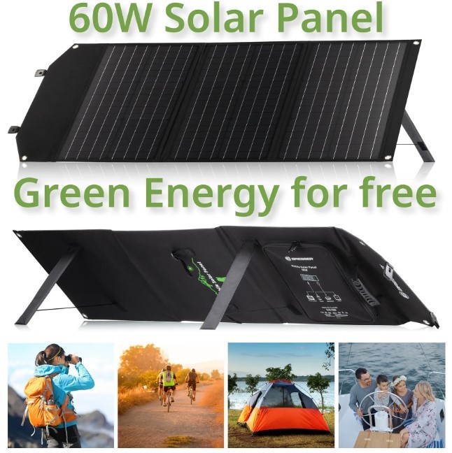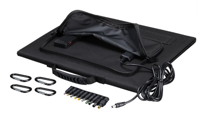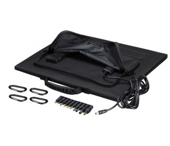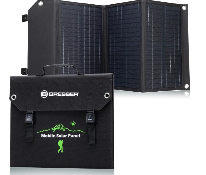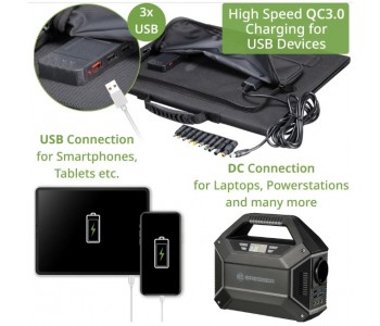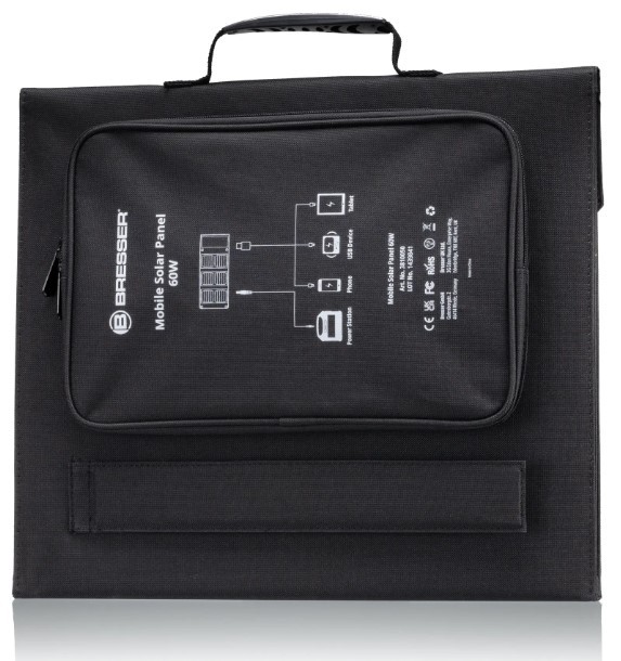 Портативний сонячний зарядний пристрій Bresser Mobile Solar Charger 60 Watt призначений швидко заряджати смартфони, планшети, ноутбуки та зовнішні акумуляторні батареї. Інноваційна технологія сонячних батарей, на основі монокристалічних кремнієвих елементів, забезпечує високу ефективність та максимально швидку зарядку різних акумуляторів. Міцна та надійна тканина Cordura захищає сонячну панель від механічних пошкоджень та забезпечує необхідну стабільність під час використання. Сонячна панель має додатковий захист завдяки застосуванню при виготовленні пило- та водовідштовхувальних матеріалів, але не розрахована на використання під проливним дощем або зануренню безпосередньо у воду. Для надійної фіксації панелі до об'єкту (палатка, автомобіль, рюкзак, дерево), в комплект поставки входять 4 міцні карабіни.