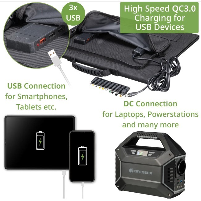 Зарядний пристрій Bresser Mobile Solar Charger 60 Watt підходить для заряджання великих електростанцій, наприкладі електростанцій Bresser 100 Watt (арт. № 3810000) та електростанція Bresser 500 Watt (арт. № 3810020), а також електростанції інших виробників з відповідними параметрами підключення.