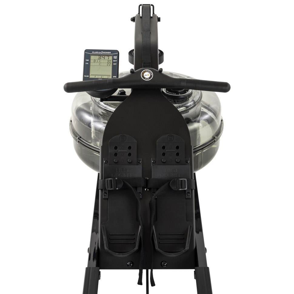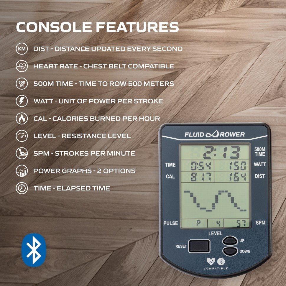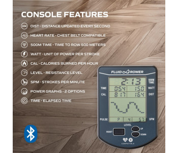 Fluid Bluetooth Monitor дає миттєву інформацію про всі ваші параметри тренування, такі як час, вати, калорії, відстань та кількість гребків за хвилину. Крім того, монітор автоматично відображає рівень опору, який ви встановили за допомогою циферблата на тренажері веслування. Ви також можете підключитися до тренувальних програм, таких як Fluid Connect, Regatta, Asensei, EXR та Kinomap, за допомогою Bluetooth.