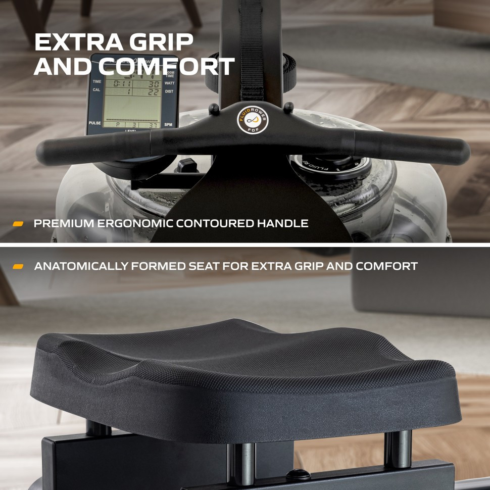 Веслування з тренажерами Fluid звучить, відчувається і виглядає так, ніби ви знаходитесь на воді завдяки високоякісному резервуару для води із запатентованою технологією Twin Tank. Ця унікальна система дозволяє легко регулювати опір води у будь-який час за допомогою циферблату.
