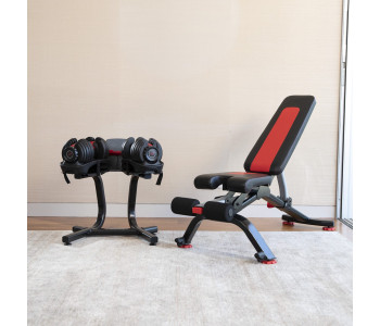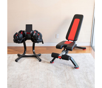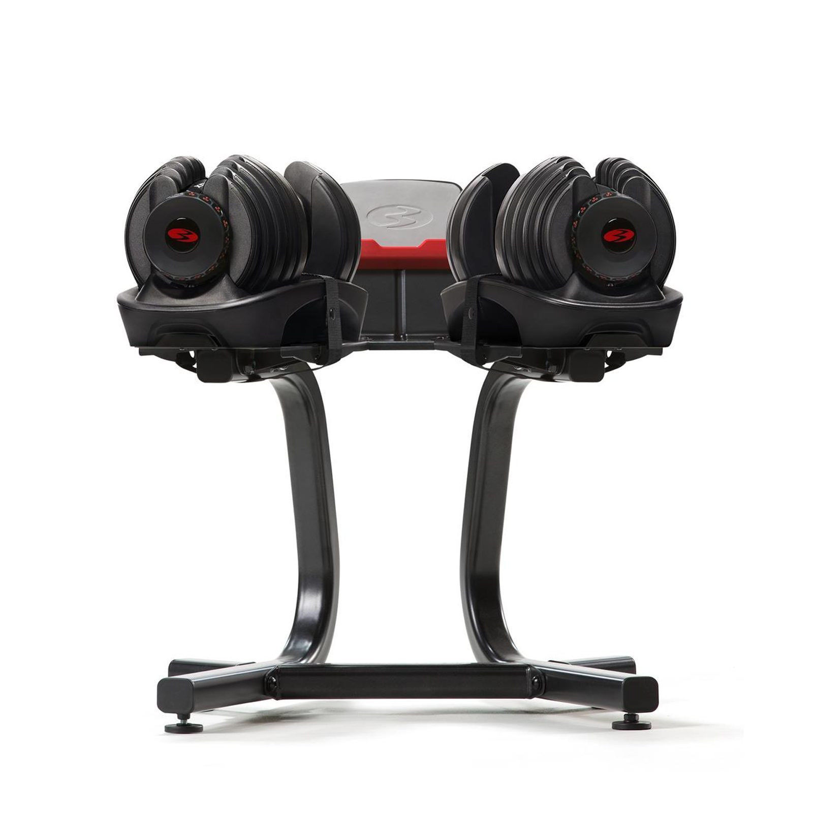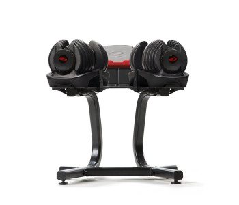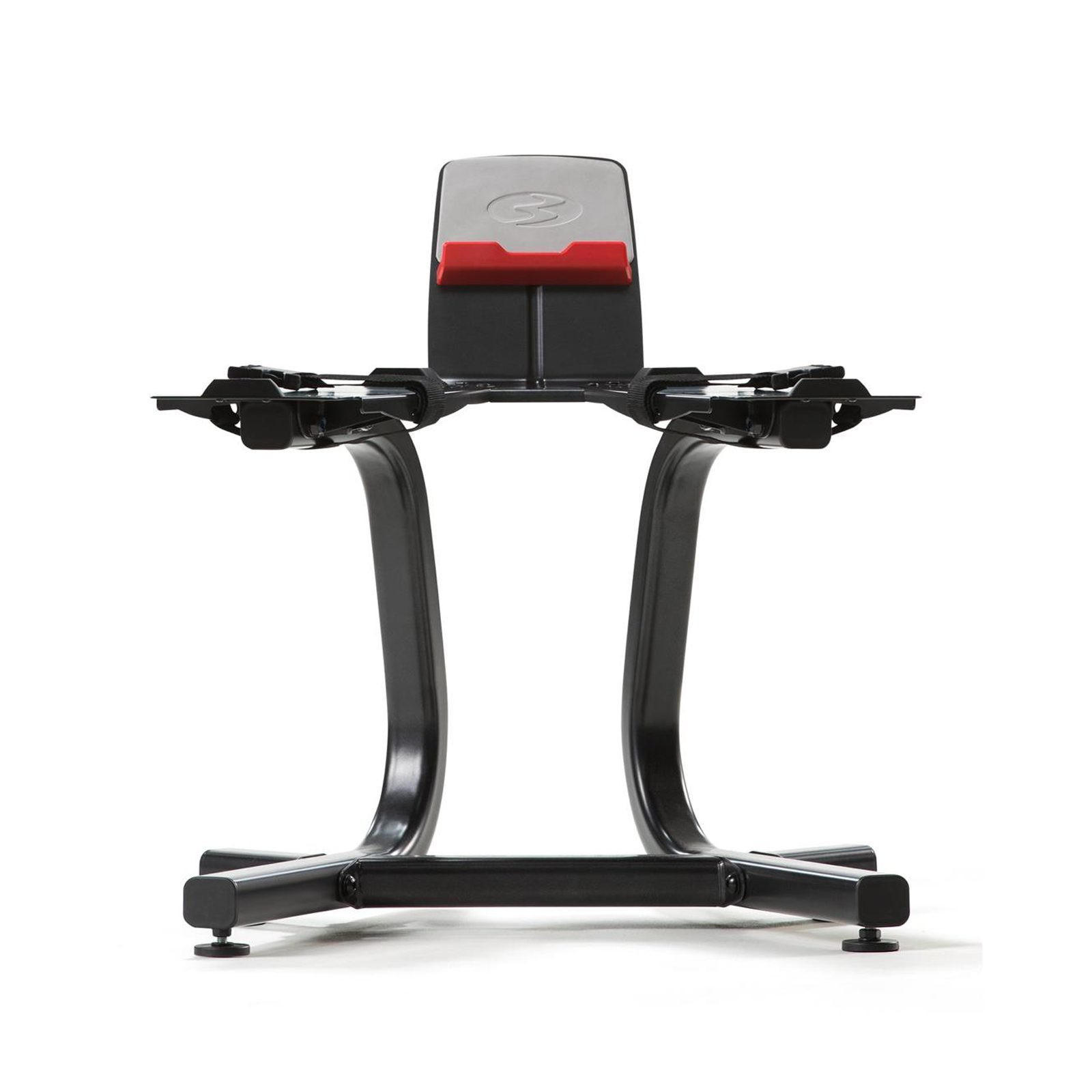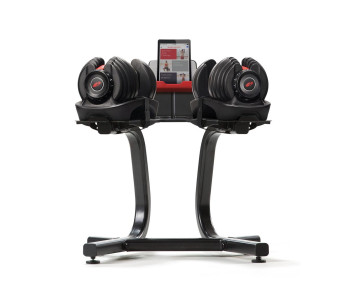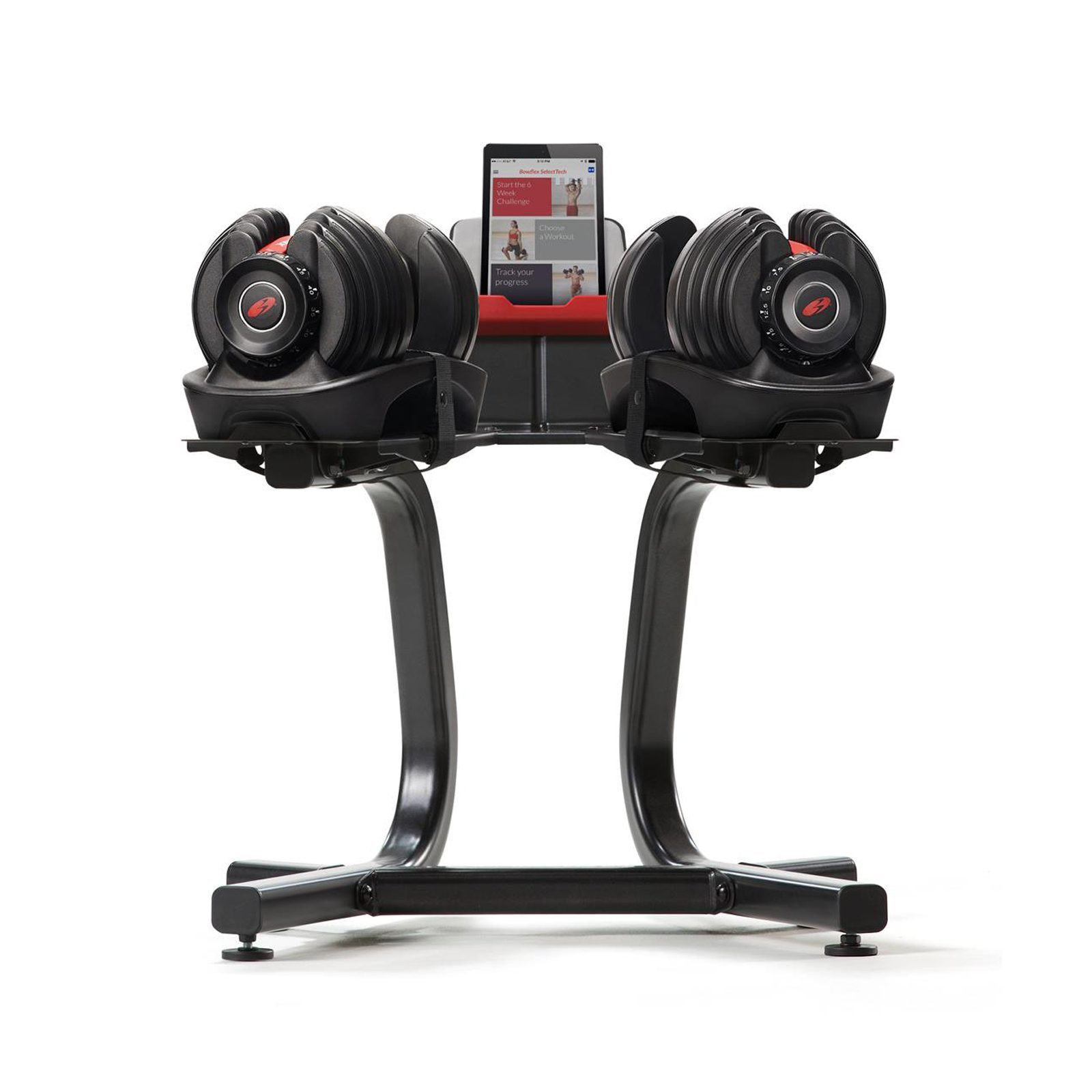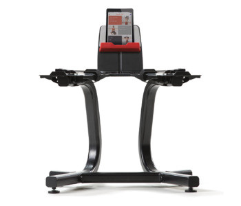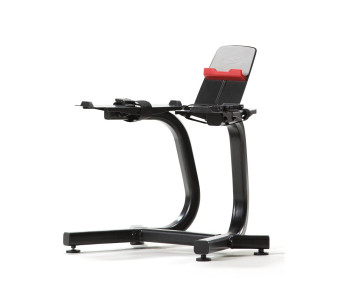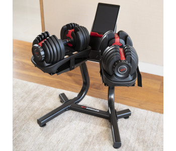 Стійка для гантелей SelectTech від Bowflex розроблена таким чином, щоб зберігати гантелі вдома було зручно і не потрібно багато місця. Крім того, стенд обладнаний лотком для мобільних пристроїв, тому ви завжди можете мати доступ до навчальних фільмів та матеріалів бренду Bowflex.