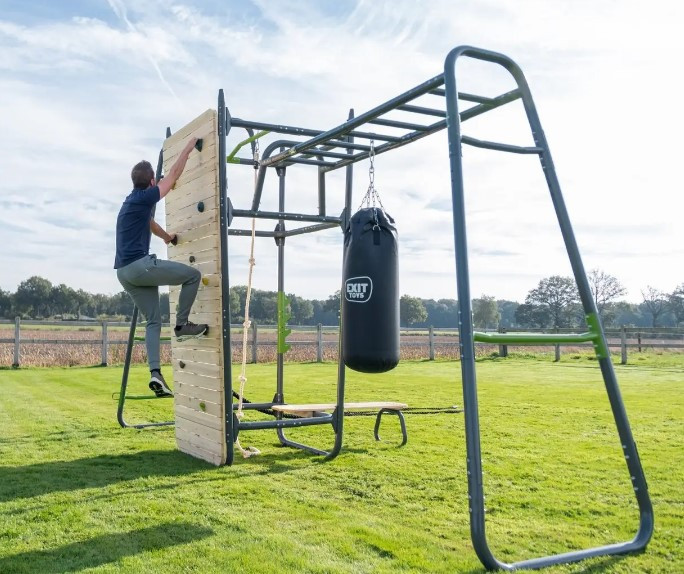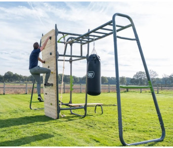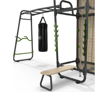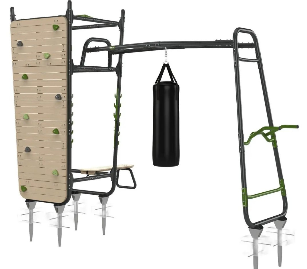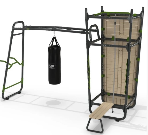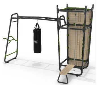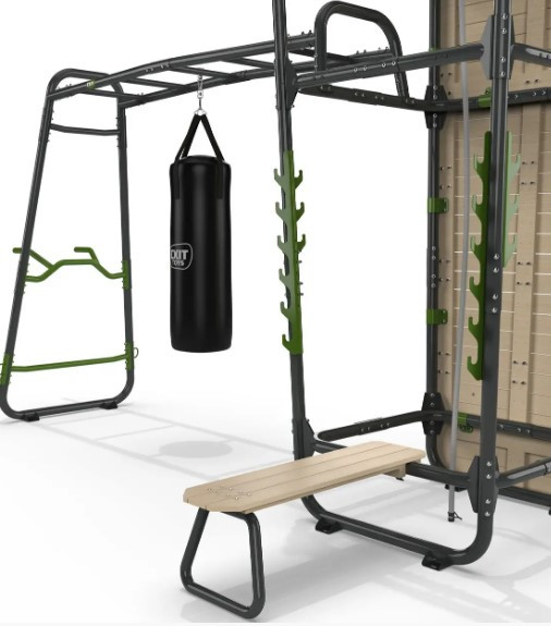 Воркаут Exit GetSet MB520 — чудовий спортивний комплекс для ігор і фітнесу на вулиці. До комплектації входять такі аксесуари: турнік-планка, бруси, турнік для підтягувань, дошка для скелелазіння, кільця для кріплення силового каната, боксерська груша, канат, лава для жима, тримачі для штанги.