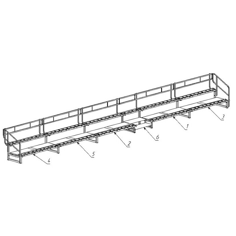 Настил підлоги та сходових маршів - металевий рифлений лист (можливе використання фанери з покриттям). Наявність бічних і заднього огорож забезпечує безпеку глядачів при вході та виході з трибун. Трибуна може бути піднята над рівнем підстави до 1500 мм (для зручності огляду через борти хокейної коробки, рекламні щити та ін.) Вхід на трибуну може бути виконаний з будь-якого боку за технічним завданням Замовника.
