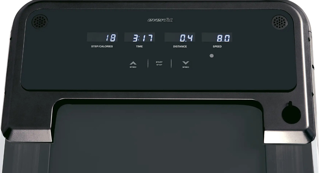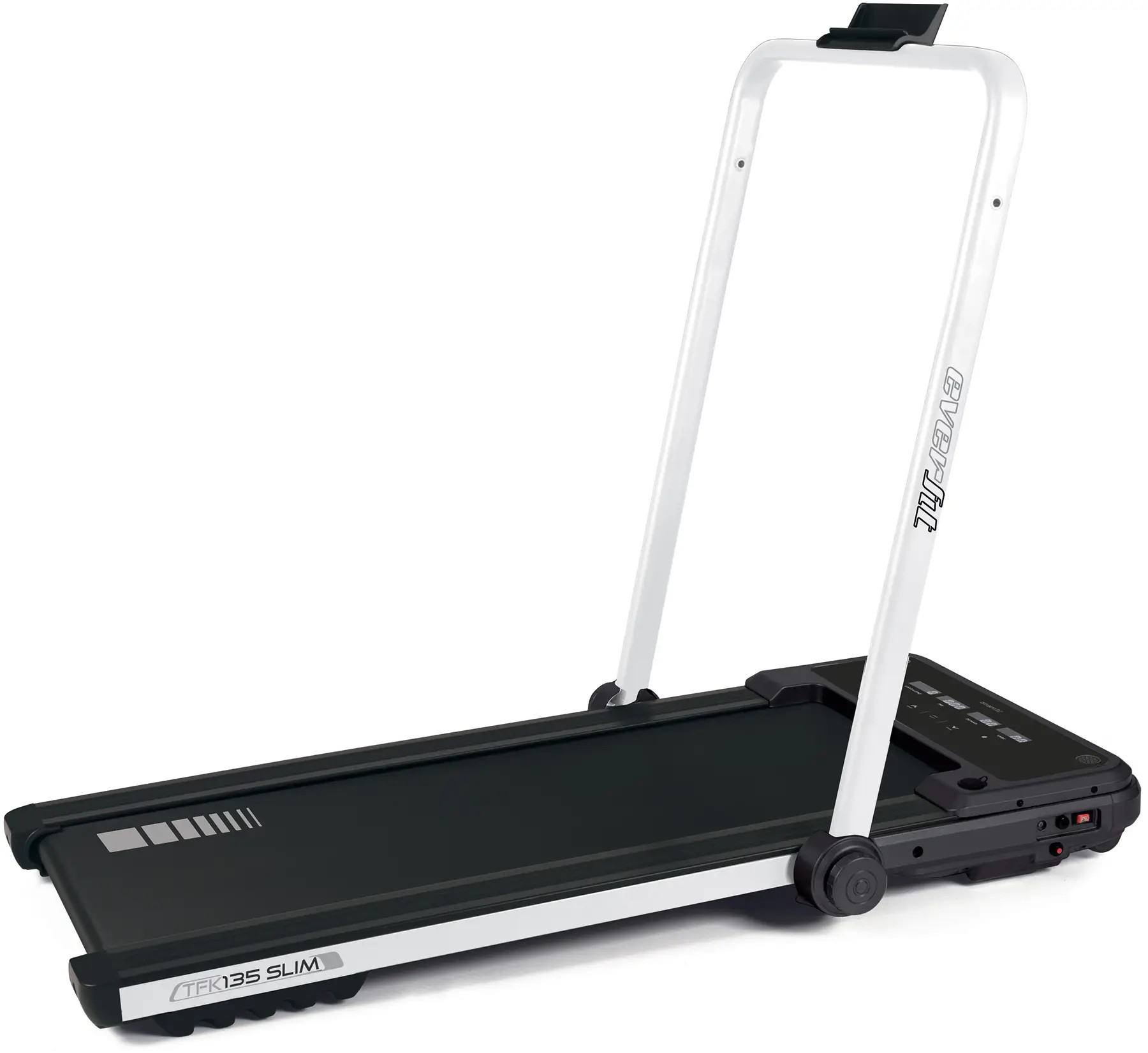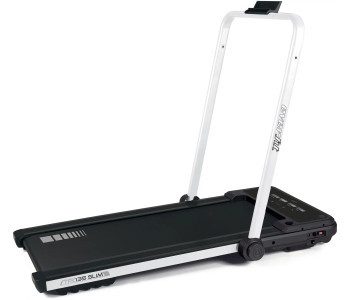 Бігова доріжка Everfit Treadmill TFK 135 Slim Pearl White (TFK-135-SLIM-W) із лінійки Slim Line італійського виробника Garlando S.p.A. призначена для спортивної ходьби та бігу в домашніх умовах. Модель оснащена попередньо зібраною рамою та транспортувальними роликами, завдяки чому її легко переміщати по квартирі. Бігова доріжка проста в управлінні, має сучасний елегантний дизайн і гарні технічні характеристики. Тренажер розрахований на максимальне навантаження до 90 кг і дозволяє розвивати швидкість від 0,8 до 8 км/год. Бігове полотно розміром 112 х 40 см достатнє для тренування користувачам зростом до 180 см. Зрозумілий дисплей із чотирма білими світлодіодними екранами знаходиться на панелі двигуна, де ви можете переглядати інформацію про швидкість, дистанцію, час, витрату калорій і кроки. Бігова доріжка Everfit Treadmill TFK 135 Slim Pearl White (TFK-135-SLIM-W) має підставку для смартфона/планшета, знімні поручні для додаткової безпеки, пульт дистанційного керування, а також вбудовані динаміки для з'єднання по Bluetooth і автоматичну систему змащування бігового полотна.