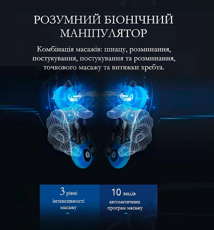 Крісло поєднує кілька різних масажних технік і режимів, які приносять неймовірне відчуття розслаблення, задоволення, оздоровлюючи при цьому весь організм користувача.