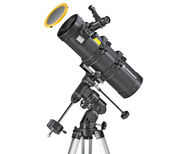 Відмінною особливістю телескопа Bresser Spica 130/1000 EQ3 Reflector Solar Carbon (4630100) є використання параболічного центрального дзеркала, завдяки якому якість зображення значно краще, ніж у аналогічних телескопів зі сферичним центральним дзеркалом. Окрім того, телескоп Bresser Spica 130/1000 EQ3 Reflector Solar Carbon (4630100) порадує своєю багатою комплектацією аксесуарів. Якщо Ви шукаєте ідеальне співвідношення якості, продуктивності і ціни - телескоп Bresser Spica 130/1000 EQ3 Reflector Solar Carbon (4630100) ідеальний вибір. Особливості системи Ньютона дозволили отримати значний фокус на відстань при невеликих розмірах оптичної труби, зробити прилад менш схильним до впливу вітру, а також зберегти зручне для спостереження бічне розташування фокусера з окуляром. Велика апертура дозволяє зібрати достатню кількість світла практично для будь-яких спостережень, які може забезпечити аматорський прилад. Велика фокусна відстань телескопа дає можливість отримати пристойну збільшення, використовуючи при цьому довгофокусні, якісні окуляри. Лінза Барлоу покликана при необхідності, подвоїти кратність телескопа.