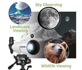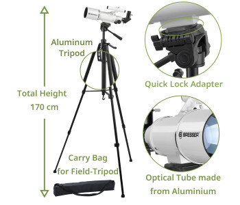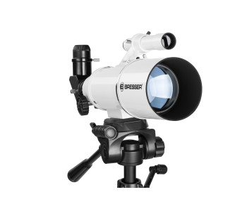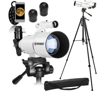 Телескоп Bresser Classic 70/350 Refractor являє собою короткофокусний середньоапертурний рефрактор з якісною оптикою. Короткофокусні ахроматичні рефрактори з діаметром лінзи 70 мм забезпечують велике поле зору і досить широкі можливості, як для планетарних спостережень, спостережень зоряних скупчень, так і для спостереження за дикою природою. Модель постачається в комплекті з обертальною призмою, яка забезпечує правильне вертикальне зображення, можна використовувати як потужну підзорну трубу. Завдяки короткому фокусу і великій світлосилі, ця модель буде дуже цікава для спостереження протяжних об'єктів слабкішого світіння, а також для так званих екскурсій зоряним небом. Телескоп поставляється практично зібраним і з необхідним набором аксесуарів для негайного старту спостережень. Телескоп Bresser Classic 70/350 Refractor укомплектований алюмінієвим штативом з можливістю регулювання по висоті від 73 до 160 см. Комплектація телескопа включає адаптера для камери смартфона (планшета).