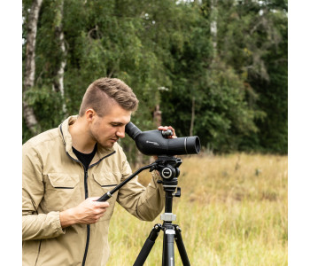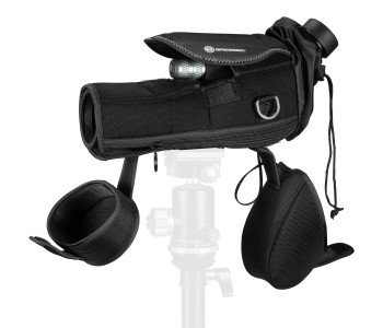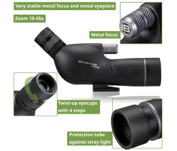 Підзорна труба Bresser Condor 15-45x50/45 Gen.II WP (4321650) підійде для спостереження за природою, спортивними заходами, спортивною стрільбою або на полюванні. Труба повністю захищена від проникнення вологи. Всі лінзи цієї моделі мають повне багатошарове покриття, а призма виготовлена з високоякісного оптичного скла BAK4. Саме завдяки всім цим характеристикам і вдається досягти чіткого і рівномірно яскравого зображення. При створенні Bresser Condor 15-45x50/45 Gen.II велика увага приділялася використанню високоякісних матеріалів. У цій серії є міцне металеве колесо фокусування, за допомогою якого можна точно налаштувати різкість. Потовщене гумове покриття, чорного кольору, надійно захищає прилад від пошкоджень та забезпечує надійний захват підзорної труби рукою. Для максимального комфорту спостереження встановлений окуляр під кутом 45º. Фокусування зроблено у вигляді маховичка невеликого діаметру, розташованого в центральному положенні, що зручно для використання, незалежно від того, якою рукою проводити фокусування. Для більшого комфорту спостережень застосований поворотно-висувний наглазник. Висувна бленда забезпечує надійний захист від сонячних відблисків і від опадів. Кришки об'єктива та окуляра надійно фіксуються на своїх місцях і точно не загубляться під час руху. Для зручності транспортування та зберігання в комплекті передбачено польовий нейлоновий чохол. Конструкція чохла дозволяє повноцінно користуватися трубою, не знімаючи його. Підзорна труба Bresser Condor 15-45x50/45 Gen.II WP (4321650) вдало доповнила цю серію, запропонувавши за помірну ціну поєднання надійності, якості оптики, функціональність і гарну комплектацію.