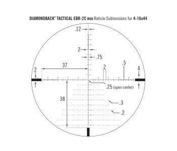 Оптичний приціл Vortex Diamondback Tactical FFP 4-16x44 EBR-2C MOA (DBK-10026) з прицільною маркою EBR-2C розташованої у першій фокальній площині об'єктива, дозволяє стрілку в повній мірі використати високоінформативну сітку EBR-2C для визначення відстані та підбору поправок по вертикалі та горизонту на будь-якій кратності збільшення. Міцний корпус, виконаного з цільного блоку алюмінію, оптична система забезпечує чудове контрастне та яскраве зображення. Відкриті барабани введення поправок мають досить низький профіль, щоб не заважати упаковці та транспортуванні, однак вони мають плавний хід і з ними дуже зручно працювати. Бічний барабан дозволить виконати відбудову від паралаксу на дистанції від 10 ярдів (9,14 м) до нескінченності.