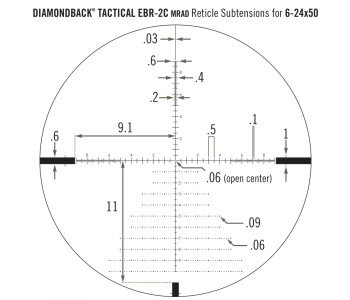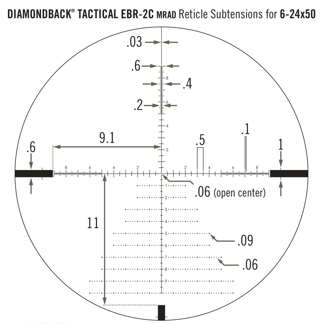 Оптичний приціл Vortex Diamondback Tactical FFP 6-24x50 EBR-2C MRAD (DBK-10029) з прицільною маркою EBR-2C (в кутових хвилинах), розташованої у фокальній площині об'єктива.