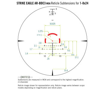 Для технічного ведення швидкісної стрільби на ближніх і середніх дистанціях потрібен надійний приціл з відмінною ергономікою та бездоганною якістю складання, що має ряд особливих характеристик, необхідних для конкретних завдань, і здатний гарантувати точність та високу повторюваність стрільби при кожному натисканні на курок. Саме такими є приціли Vortex Strike Eagle, що мають високоякісну оптику, укладену в міцний монолітний 30 мм алюмінієвий корпус. Маючи початкове збільшення 1х приціл забезпечує по-справжньому широке поле зору, полегшуючи прицілювання при швидкісній стрільбі. У той же час завдяки максимальній кратності при денному освітленні дана модель стає дуже універсальною, дозволяючи точно вразити віддалені цілі. Vortex Strike Eagle 1-8x24 має прицільну сітку AR-BDC3 IR і спеціалізований для прицільної стрільби з автоматичної зброї патронами калібру 5.56 і 7.62. Сітка біля прицілу має 11 рівнів підсвічування. Цікавим рішенням є розміщення резервної батареї живлення під кришкою барабана введення бічних поправок, а також система обнулення барабанів, що не потребує додаткового інструменту. І якщо дійсно необхідний спеціалізований надійний приціл для швидкісної тактичної стрільби або для загінного полювання, здатний в той же час впоратися і з ширшим колом завдань, але немає бажання брати кредит, варто звернути увагу на Vortex Strike Eagle 1-8x24 (AR-BDC3 IR).