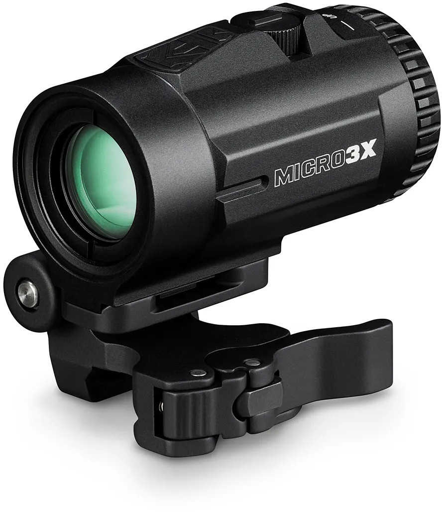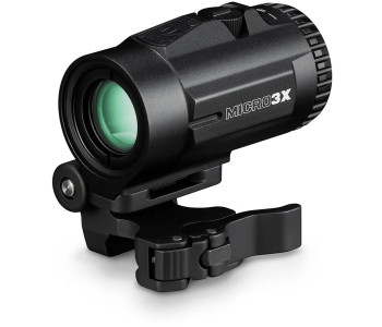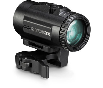 Трикратний магніфер Vortex MICRO3X призначений для збільшення дальності огляду коліматорних прицілів. Кільця ущільнювачів і цільний корпус з авіаційного алюмінію надійно захищають від попадання всередину вологи і пилу. Магніфер кріпиться на зброю на планку Пікатінні за допомогою швидкознімного кріплення. Відкидне кріплення, що регулюється, дозволяє одним натисканням кнопки і легким рухом руки швидко відвести магніфер убік для зміни мети – з дальньої на ближню.