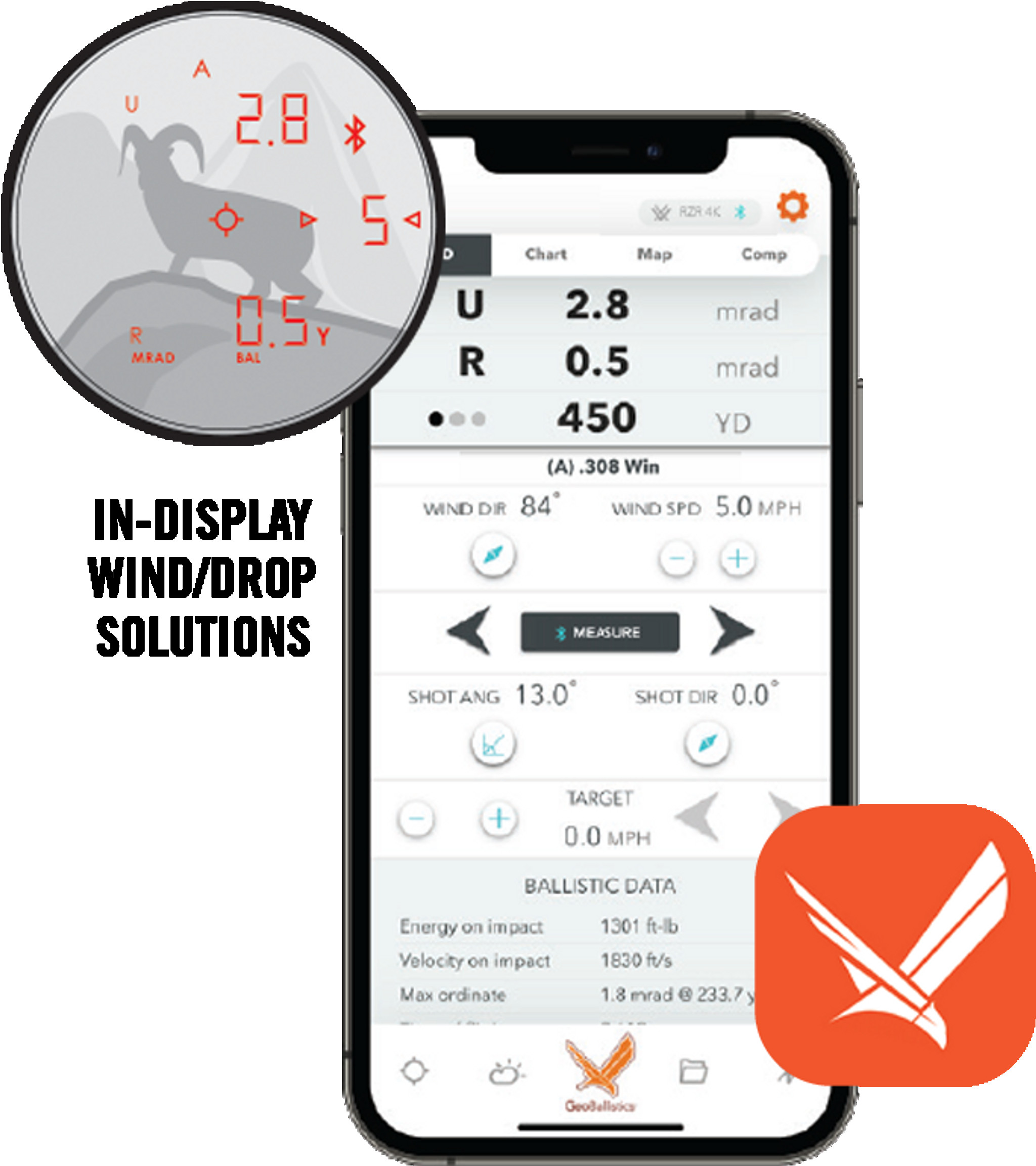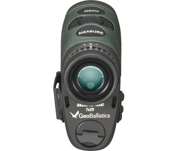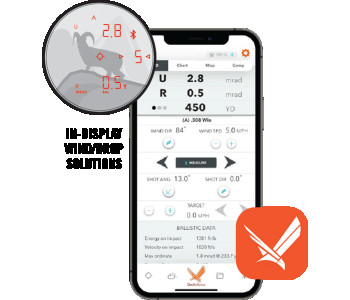 GeoBallistics® Далекомір оснащений програмою точних балістичних вимірювань GeoBallistics®, що підтримується повною актуальною базою даних про кулі. Присутня можливість створювати балістичні профілі за допомогою програми GeoBallistics® або використовувати один із трьох попередньо завантажених профілів для популярних патронів. Вбудований компас, датчики вологості, барометричного тиску та датчик температури. Має два режим обчисленя похибки на вітер. Сумісний з метеорологічними пристроями Kestrel®. Лазерний далекомір підключається через Bluetooth® до вашого мобільного пристрою та програми GeoBallistics® за допомогою пристрою на базі Apple або Android. Програму для точних балістичних вимірювань GeoBallistics® можливо завантажити з офіційних ресурсів: