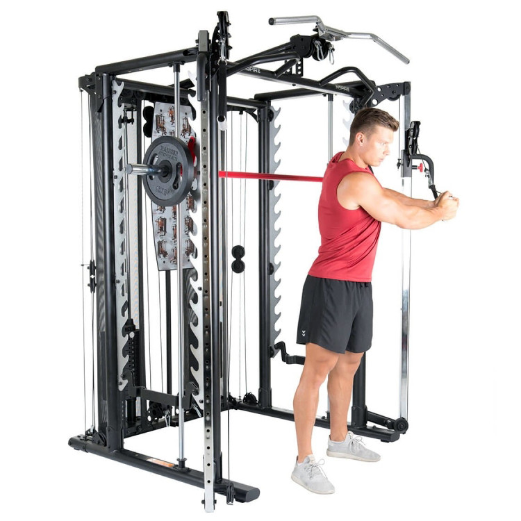 Рух грифу плавний за рахунок спеціальних напрямних, якими він рухається. Завдяки такій властивості абсолютно виключена втрата рівноваги під час занять, що прибирає необхідність вдаватися до допомоги страхуючої людини. Використовуйте диски або вагові стеки як обважнення для посилення ефекту. З таким помічником можлива для виконання просто нереальна кількість вправ: жим під різними кутами, тяга зі штангою, присідання, зведення рук перед собою, тренування литкових м'язів, станова тяга. Перелічувати можна нескінченно.