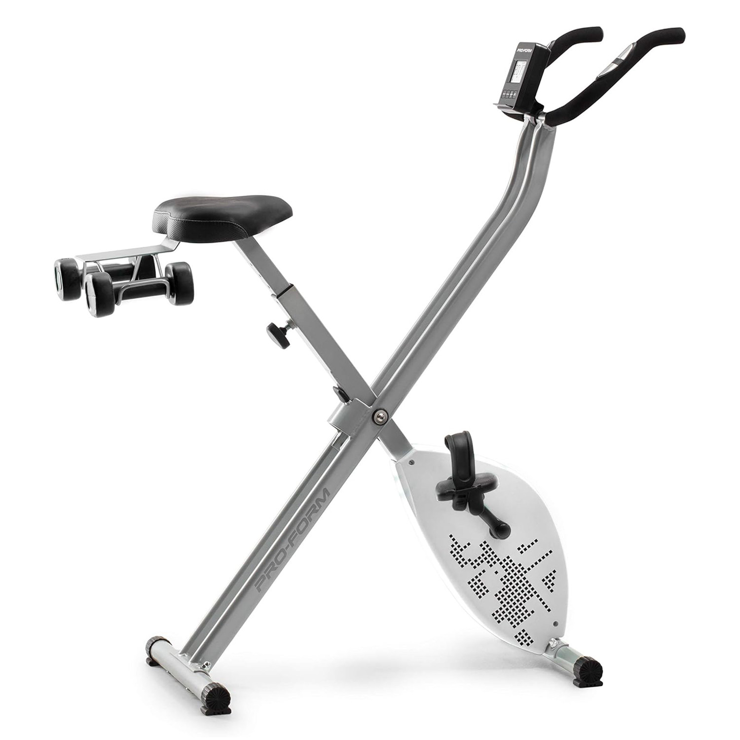 Велотренажер-трансформер ProForm X-Bike Elite - домашній кардіотренажер для фітнесу, призначений для тих людей, які хочуть заощадити якомога більше місця. Це дуже легкий, складаний тренажер з колесами транспортування, що дозволять без проблем перемістити його і зберігати після тренування вдома. Він призначений не лише для ваших ніг. Влаштуйте собі тренування всього тіла під час їзди за допомогою пари гантелей 2х1 кг, що додаються. Це ідеальна вага гантелі для вправ на верхню частину тіла під час їзди на велосипеді.